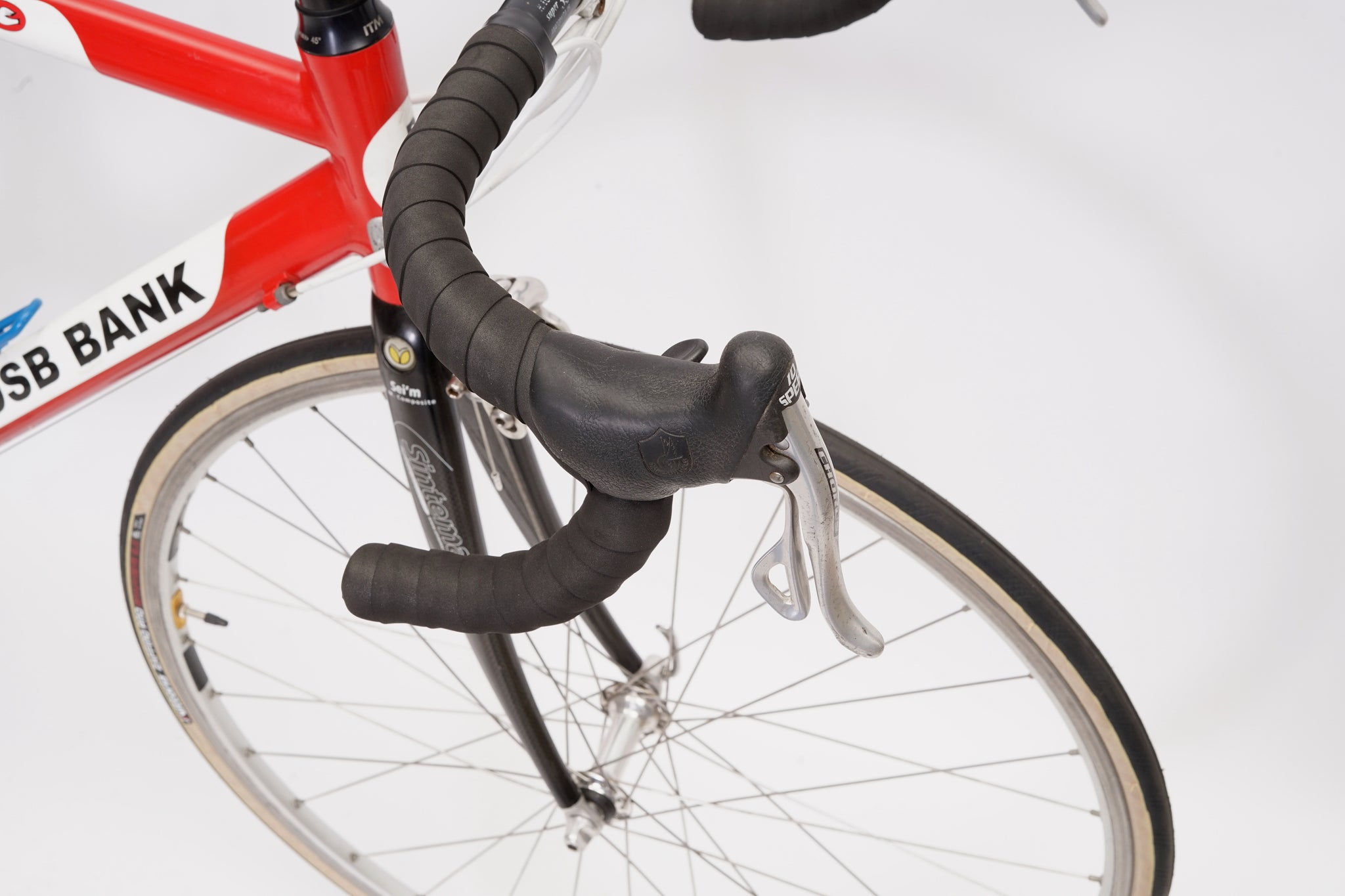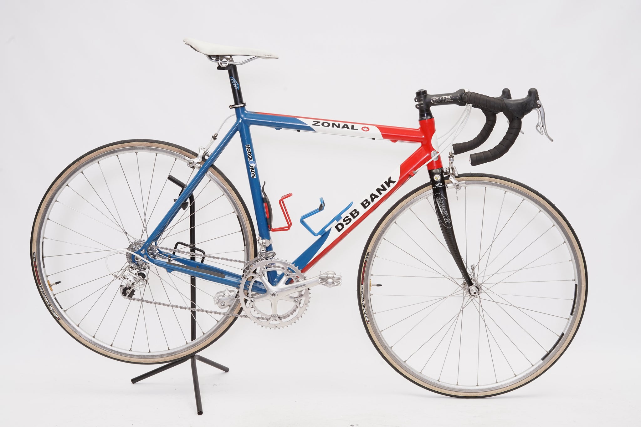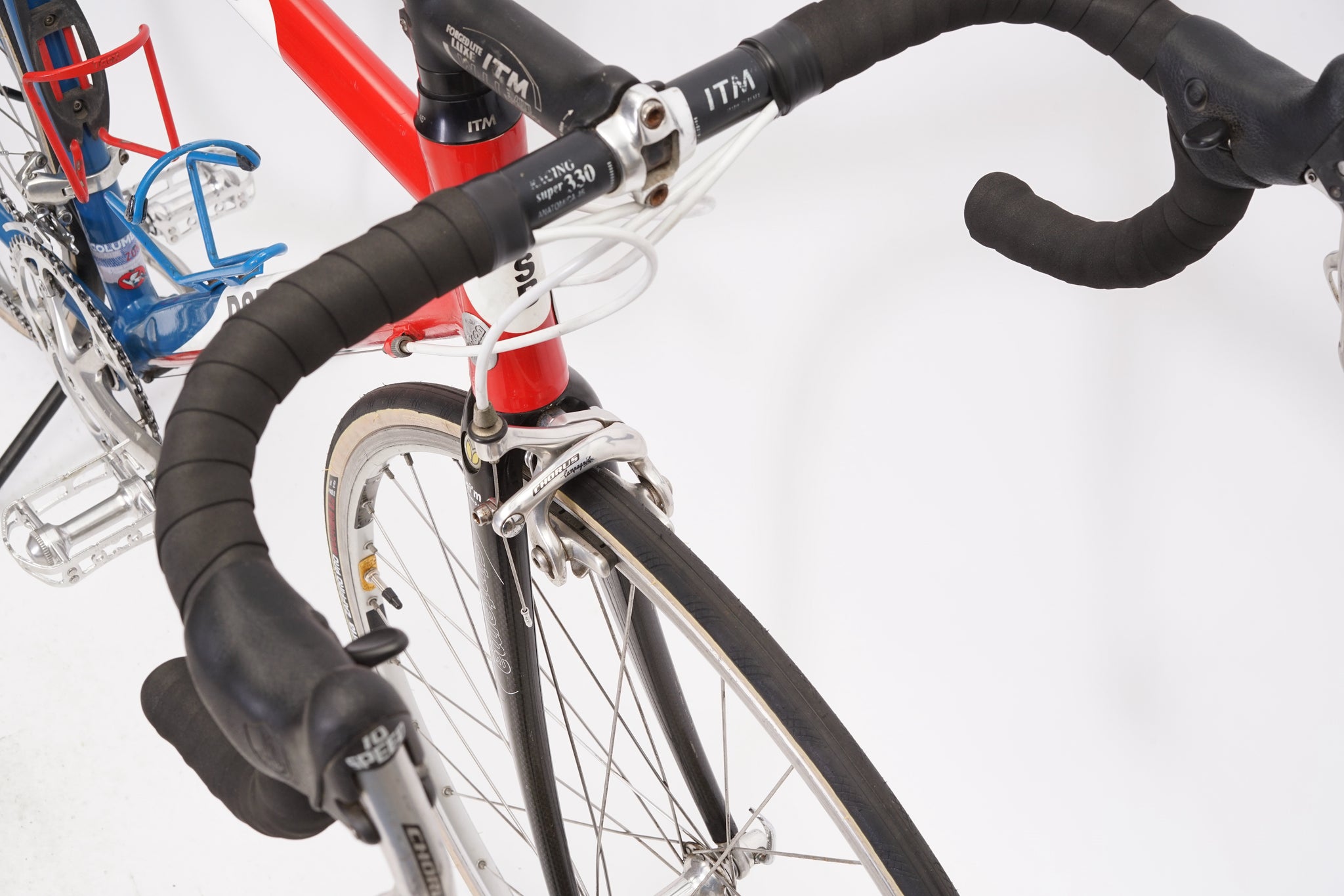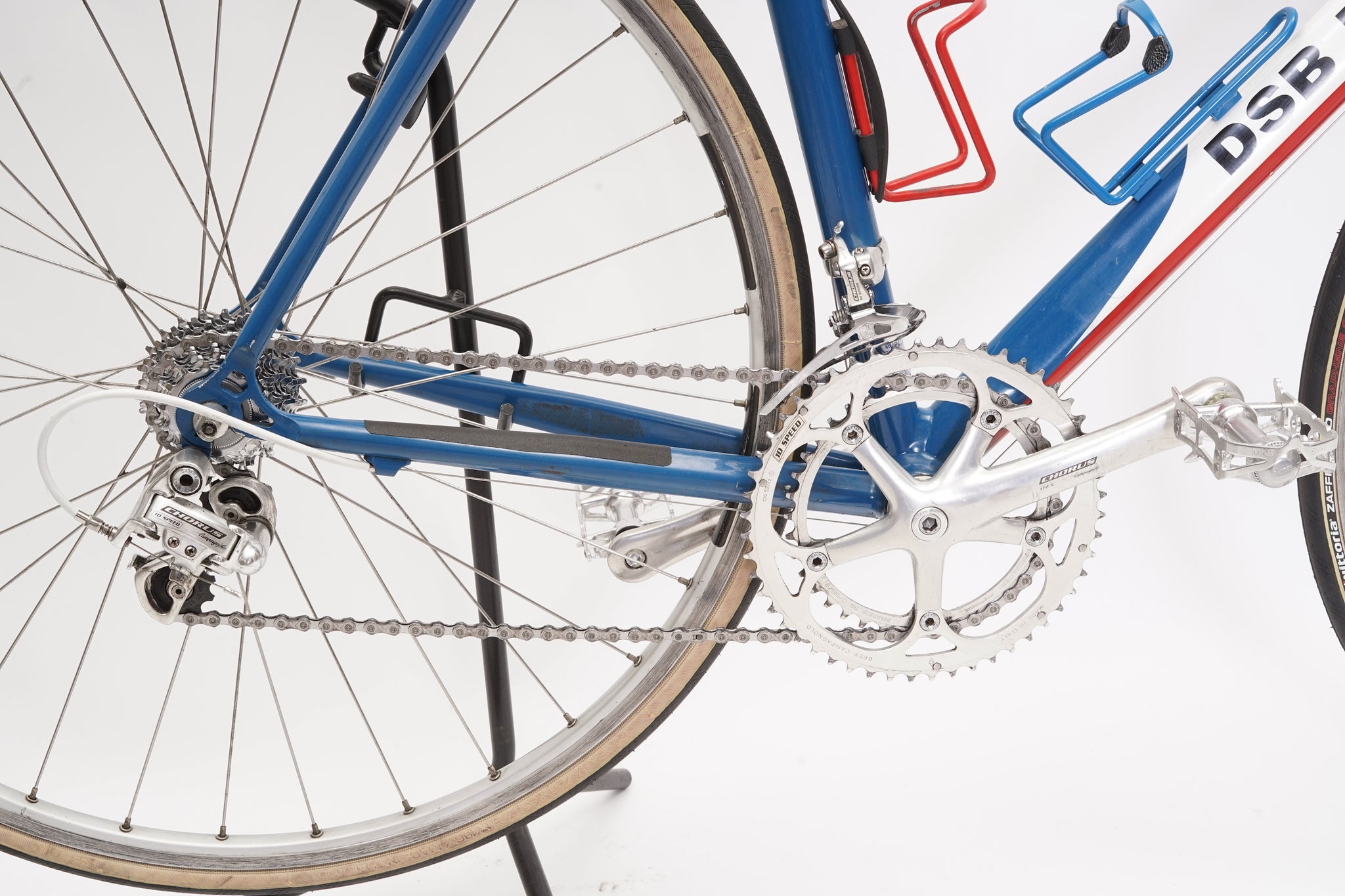 This DSB Bank racer is great for putting in some miles while enjoying the vintage style. It is equipped with a 20-speed Campagnolo Chorus gear-group and and original wheelset with Campagnolo hubs and Ambrosio rims. All mechanical gear parts are original and in great condition. A lightweight, super fast, piece of history.