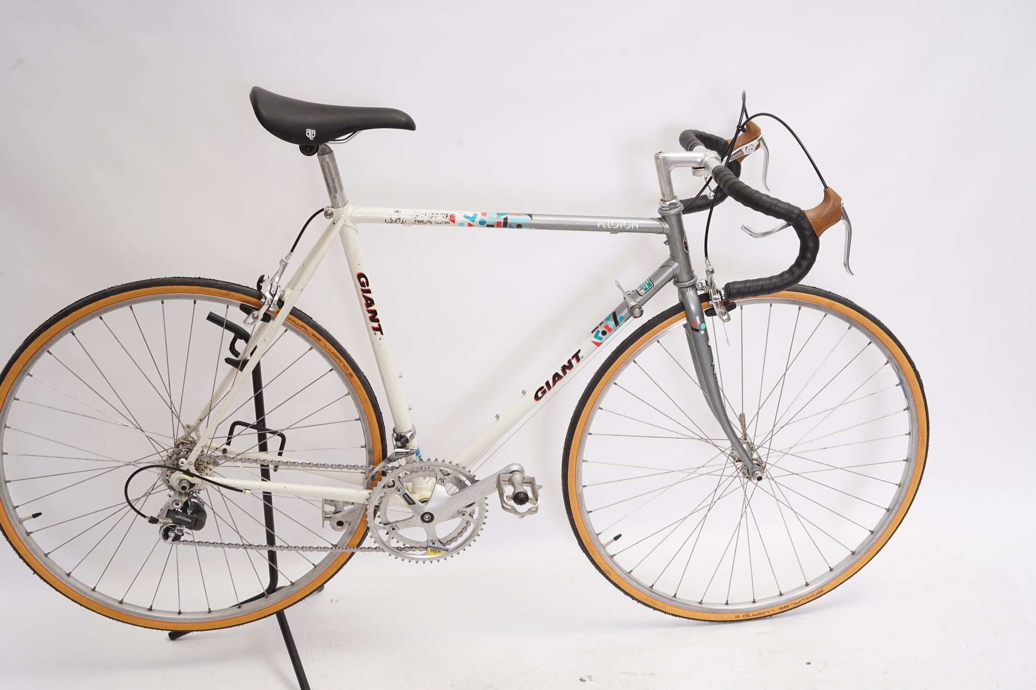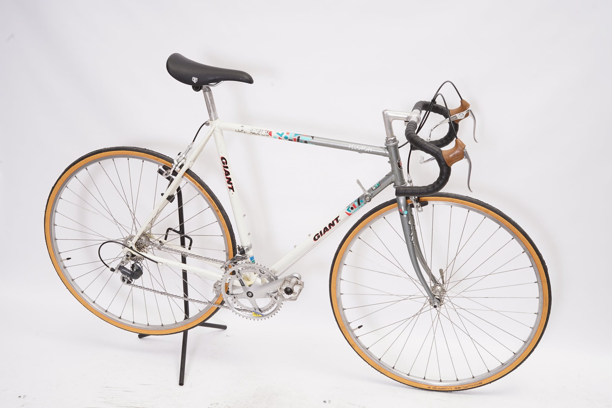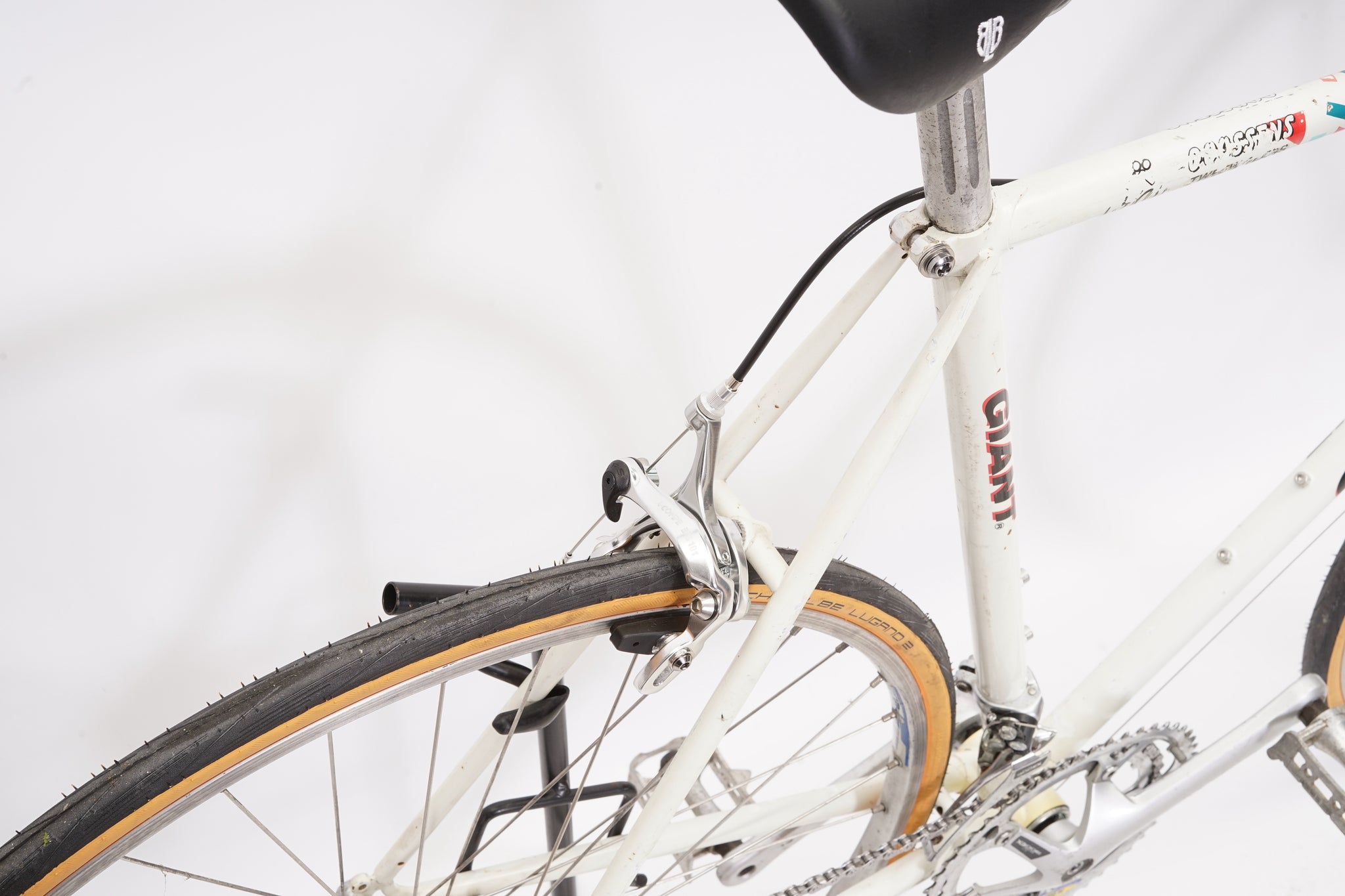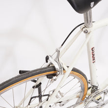 This Giant racer is great for putting in some miles while enjoying the vintage style. It is equipped with a 14-speed Shimano Exage gear-group and an original wheelset containing Wolber rims and Shimano hubs. All mechanical parts are in great condition. A lightweight, super fast, piece of history.