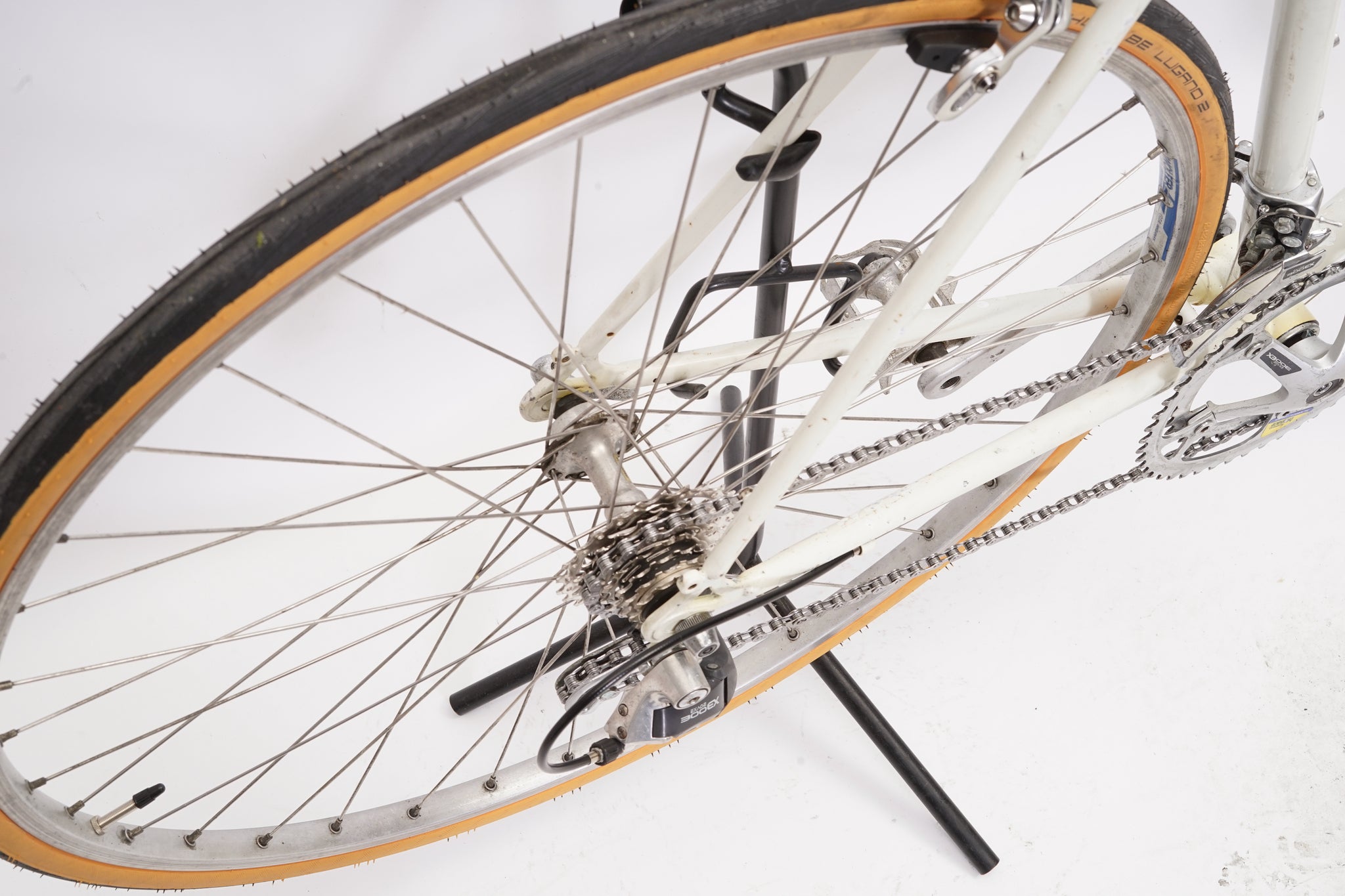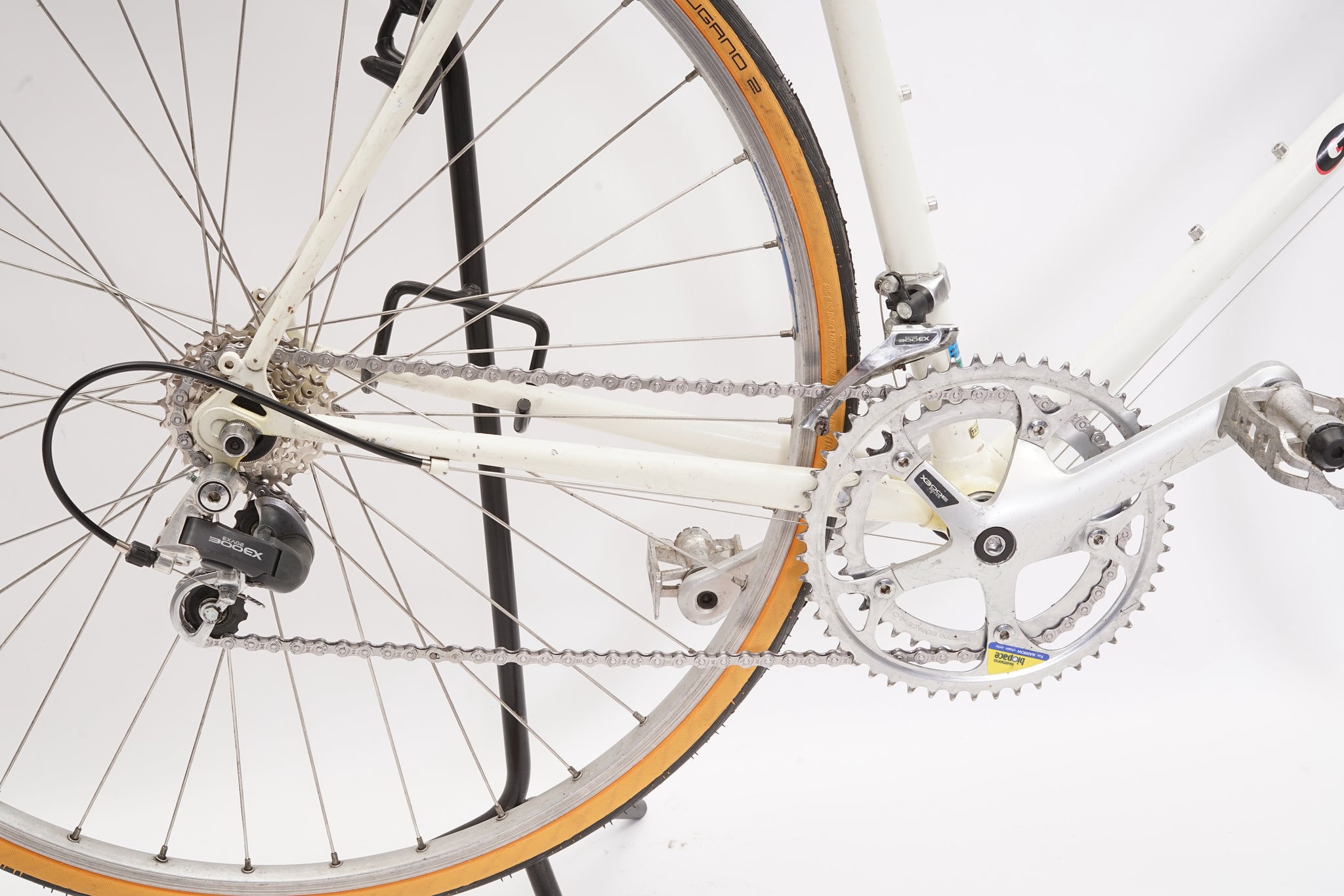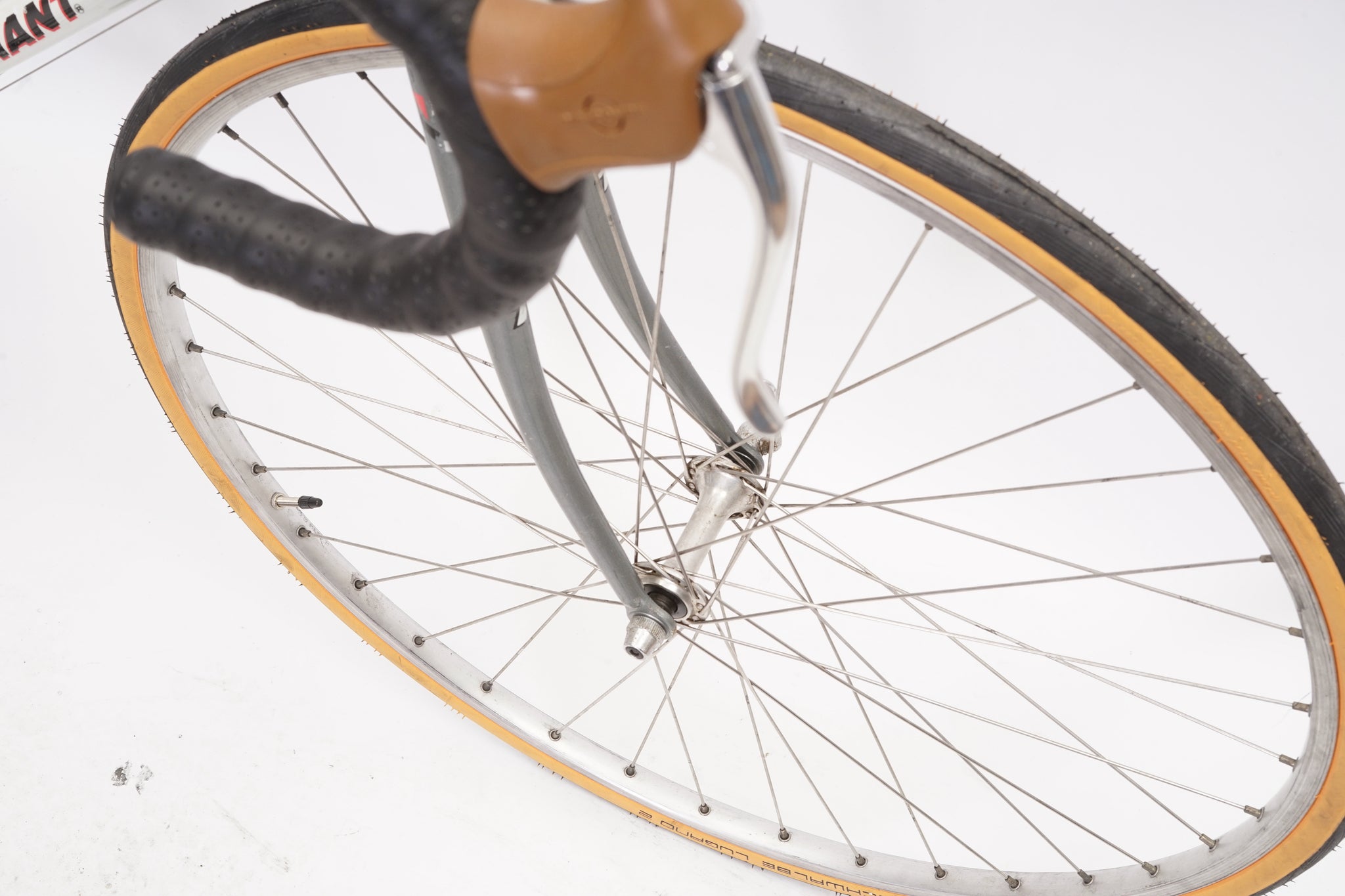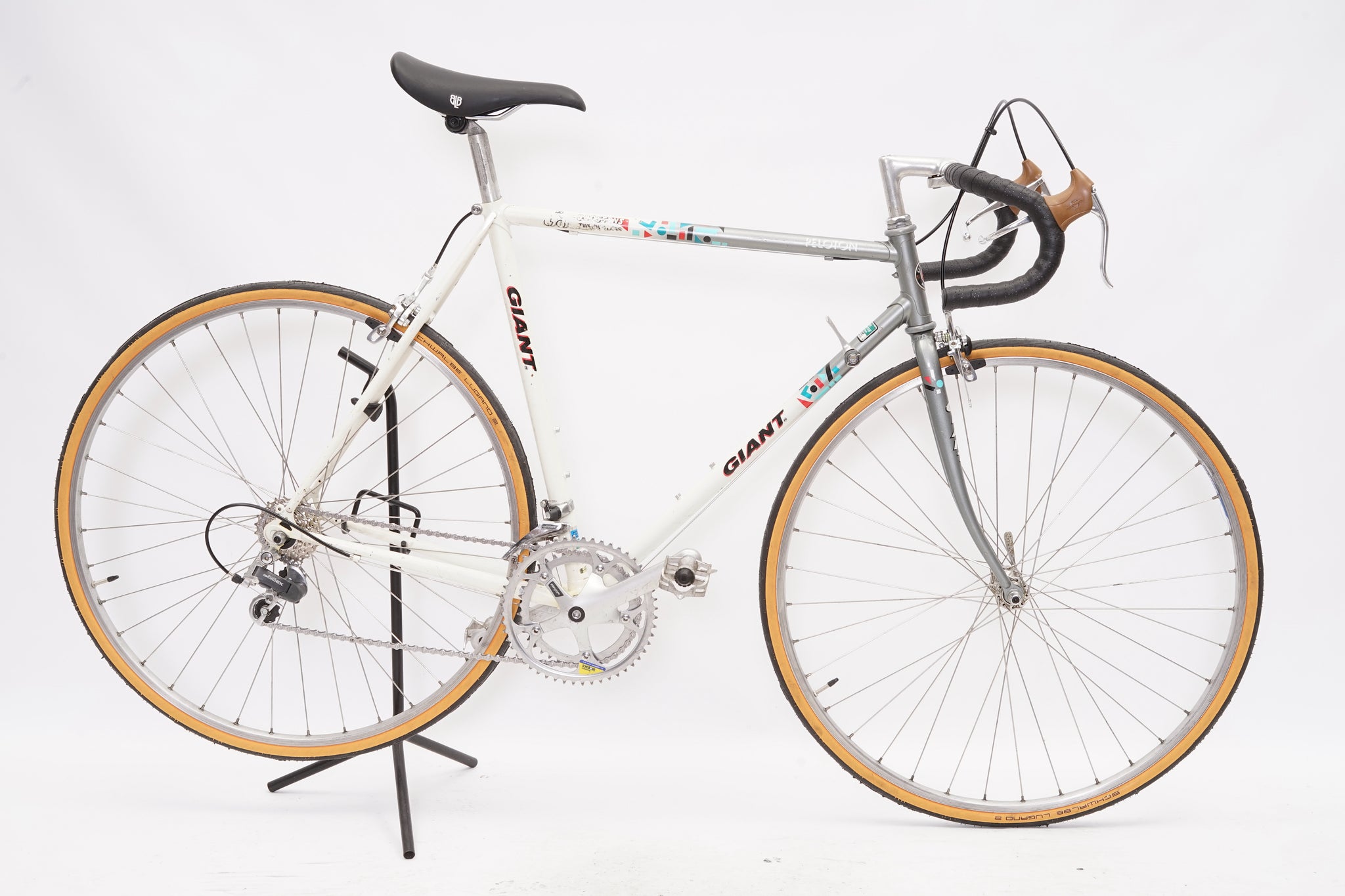 This Giant racer is great for putting in some miles while enjoying the vintage style. It is equipped with a 14-speed Shimano Exage gear-group and an original wheelset containing Wolber rims and Shimano hubs. All mechanical parts are in great condition. A lightweight, super fast, piece of history.