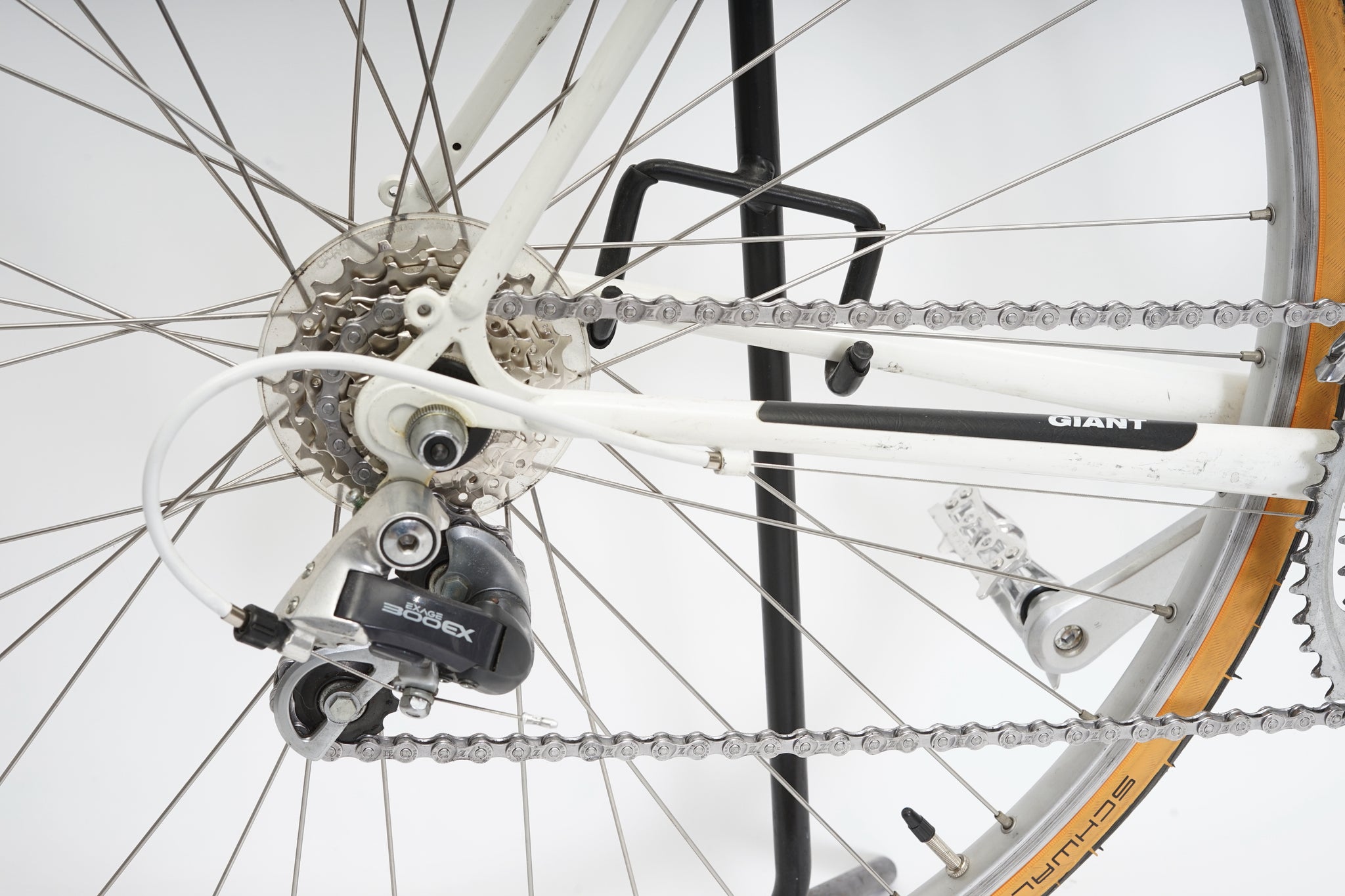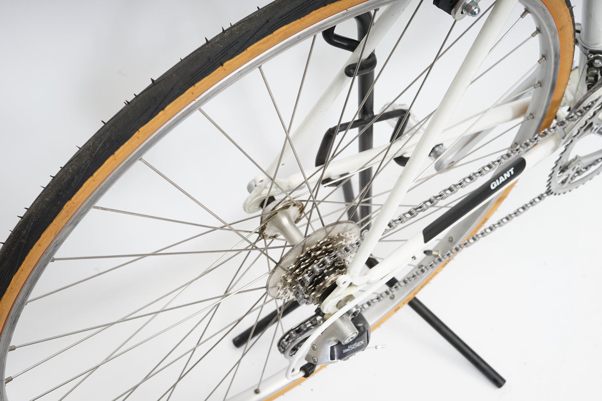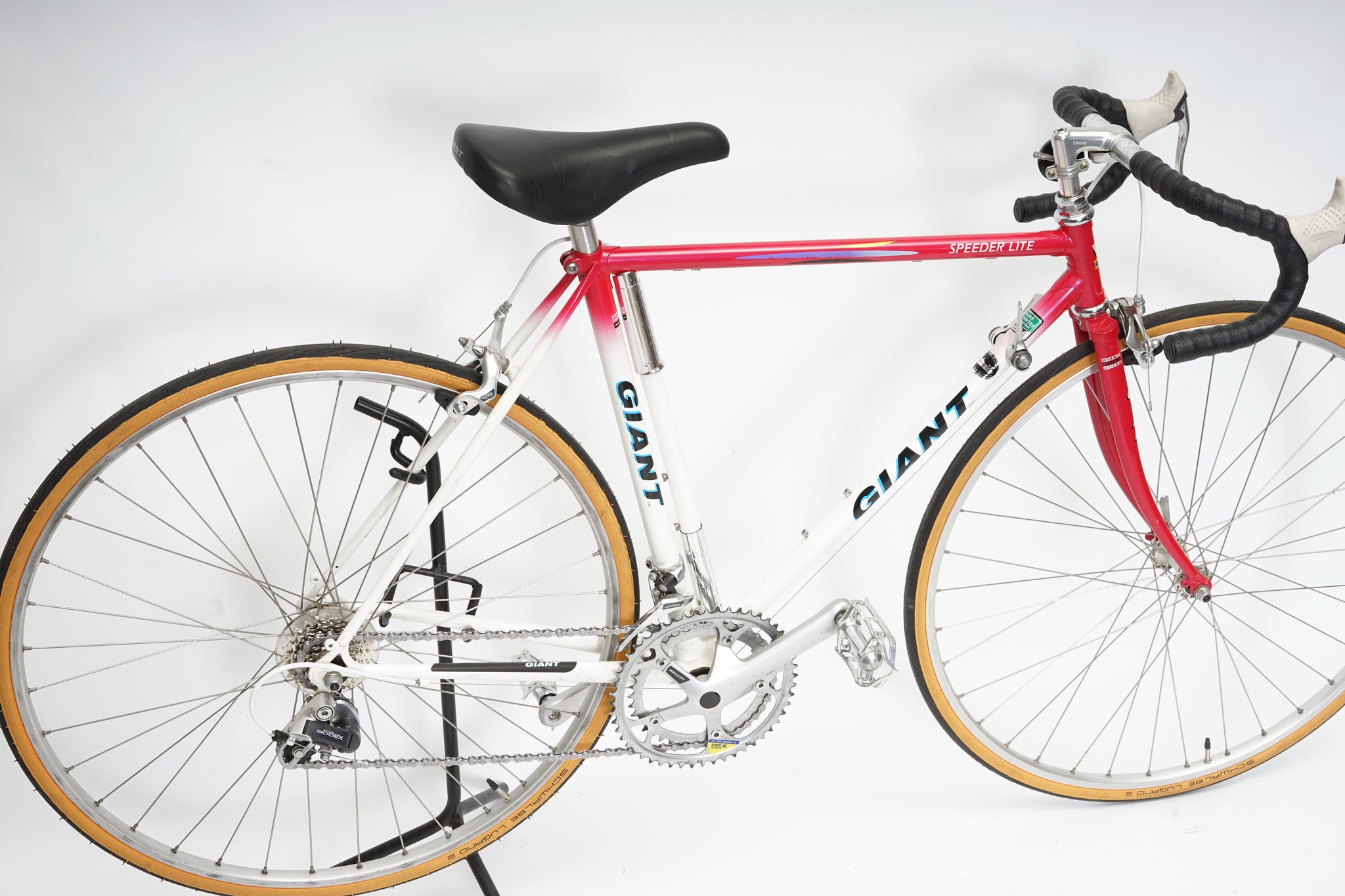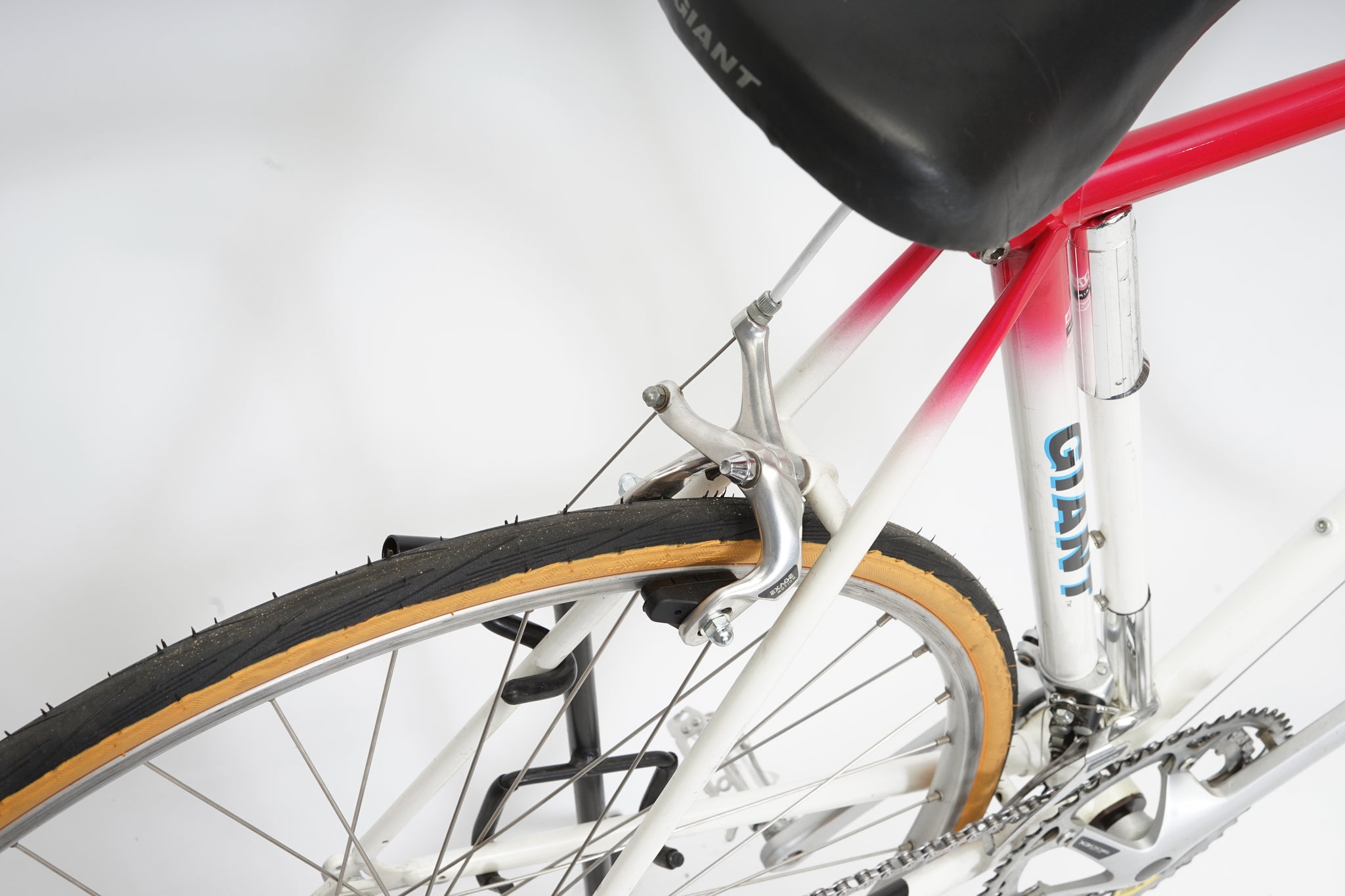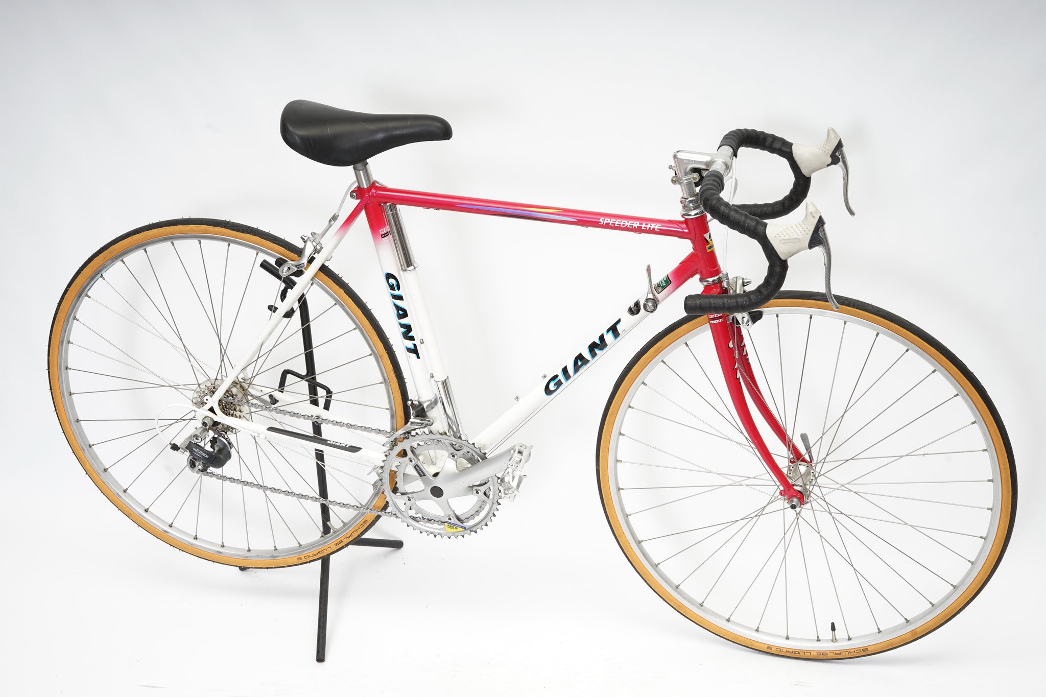 This Giant racer is great for putting in some miles while enjoying the vintage style. It is equipped with a 14-speed Shimano Exage gear-group and an original wheelset containing Shimano hubs and Wolber rims. All mechanical parts are in great condition. A lightweight, super fast, piece of history.