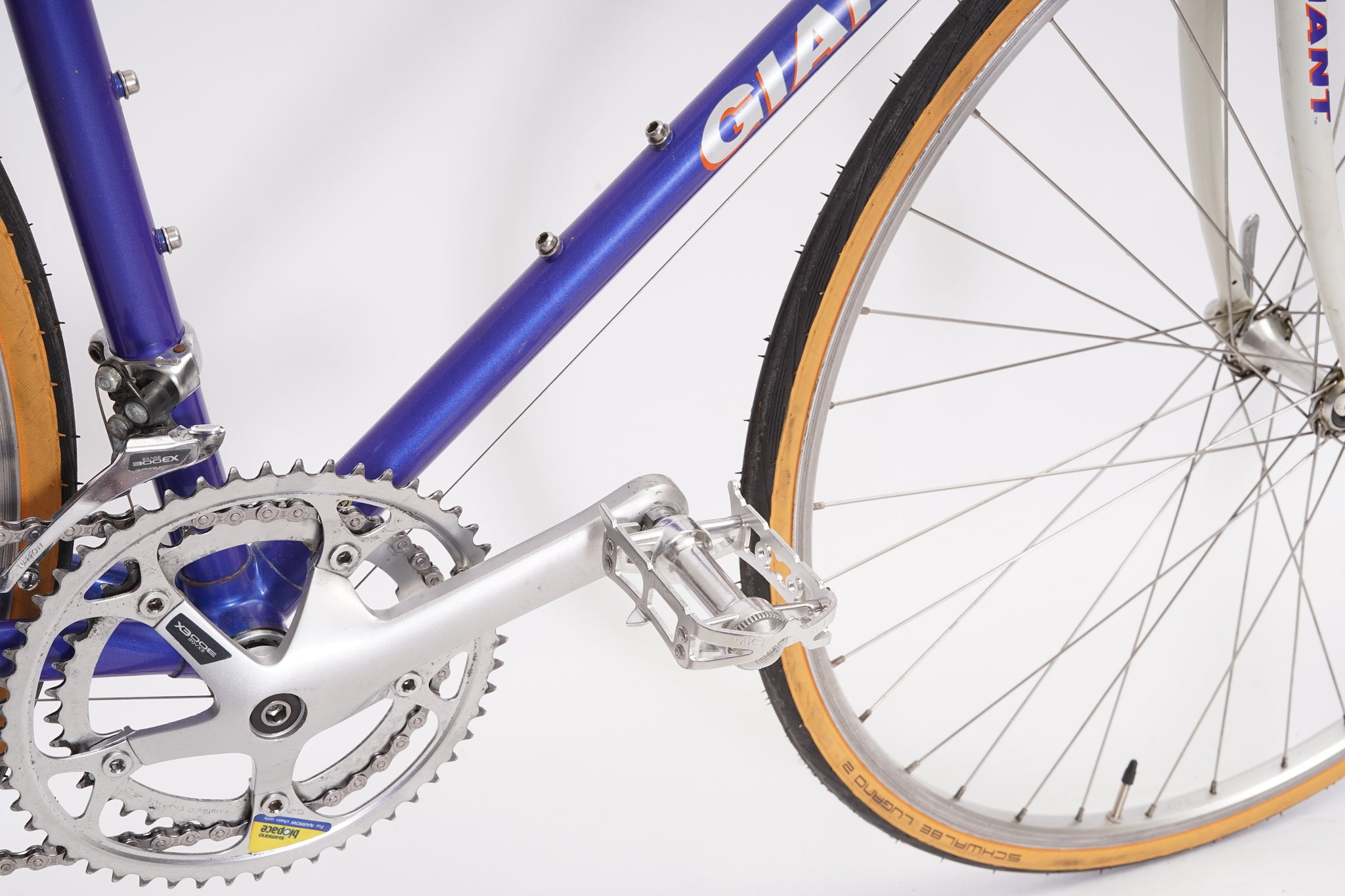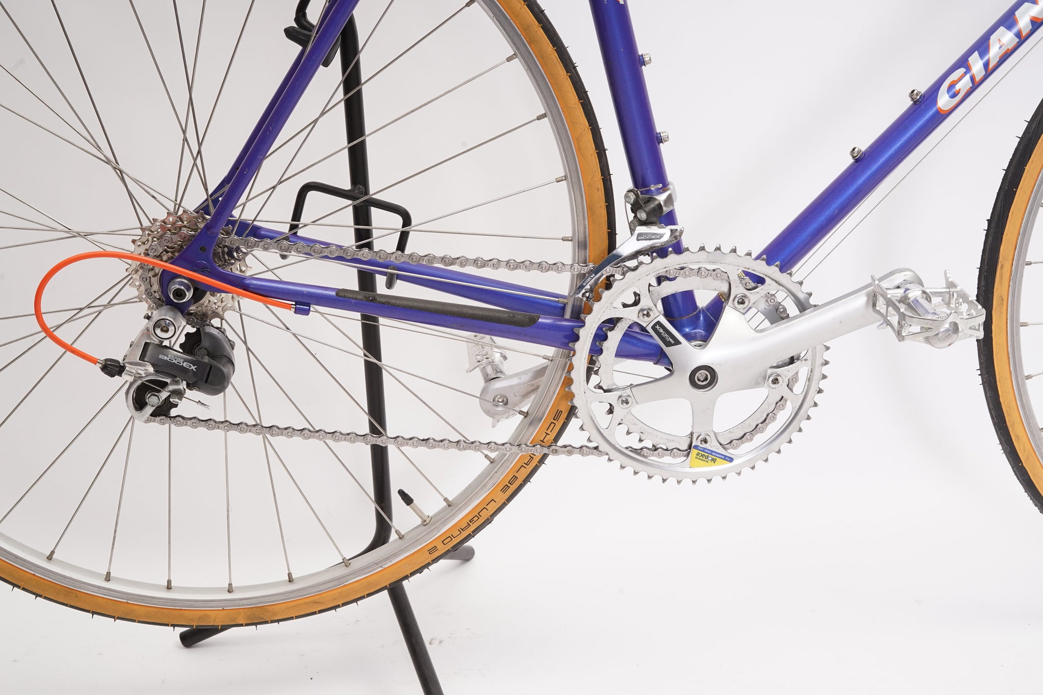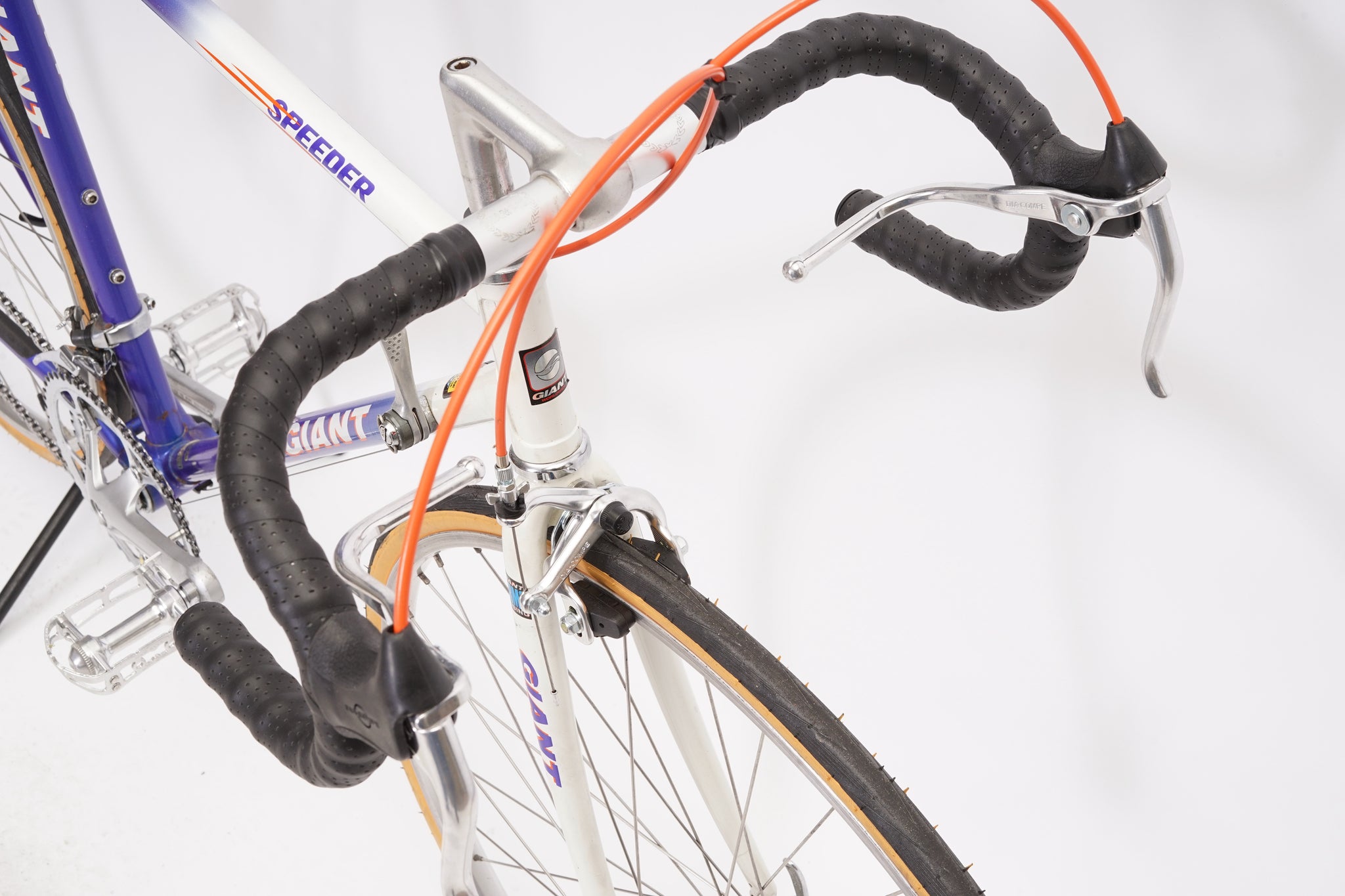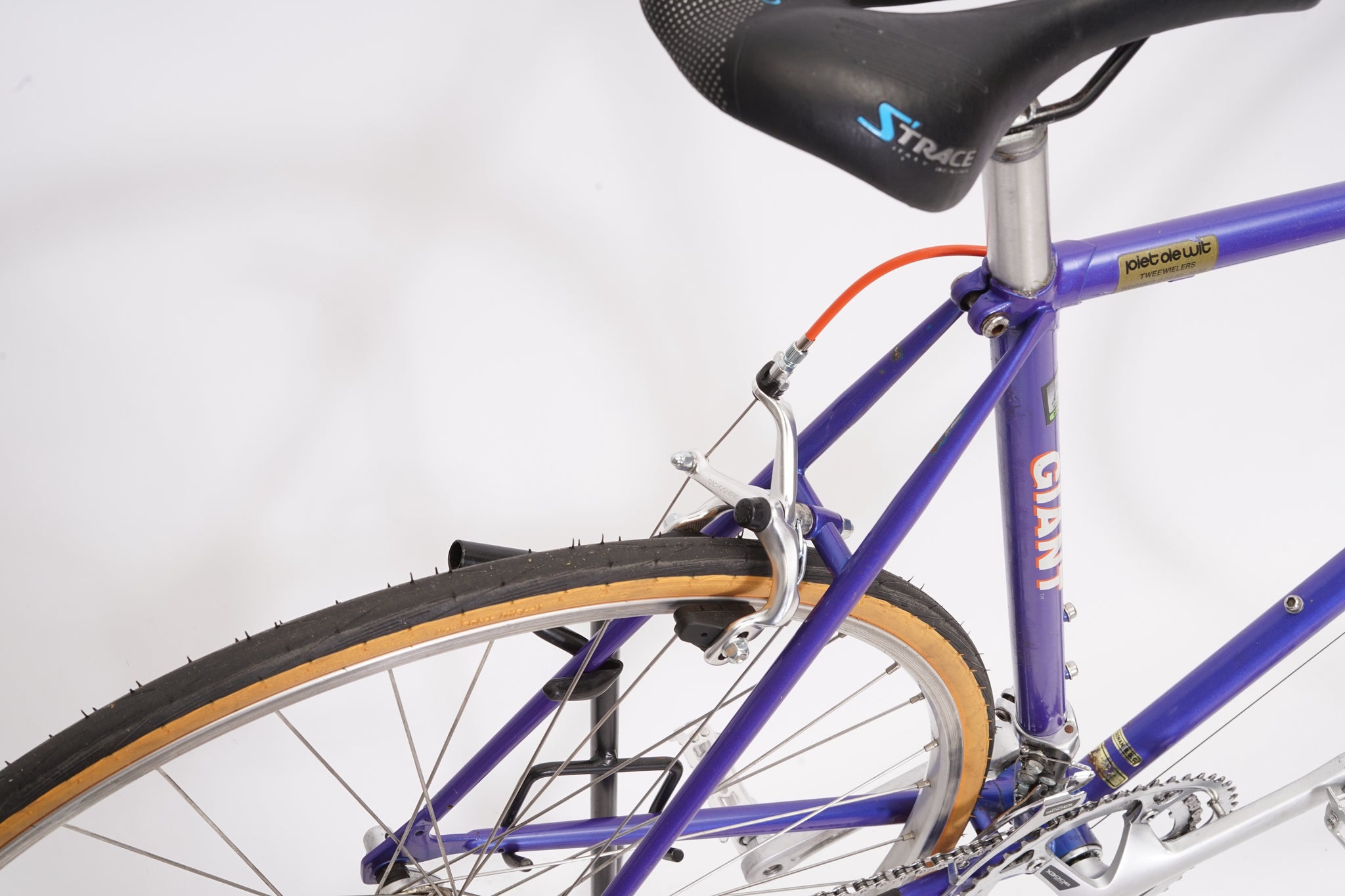 This Giant racer is great for putting in some miles while enjoying the vintage style. It is equipped with a 14-speed Shimano Exage gear-group and an original wheelset containing Araya rims and Shimano hubs. All mechanical parts are in great condition. A lightweight, super fast, piece of history.