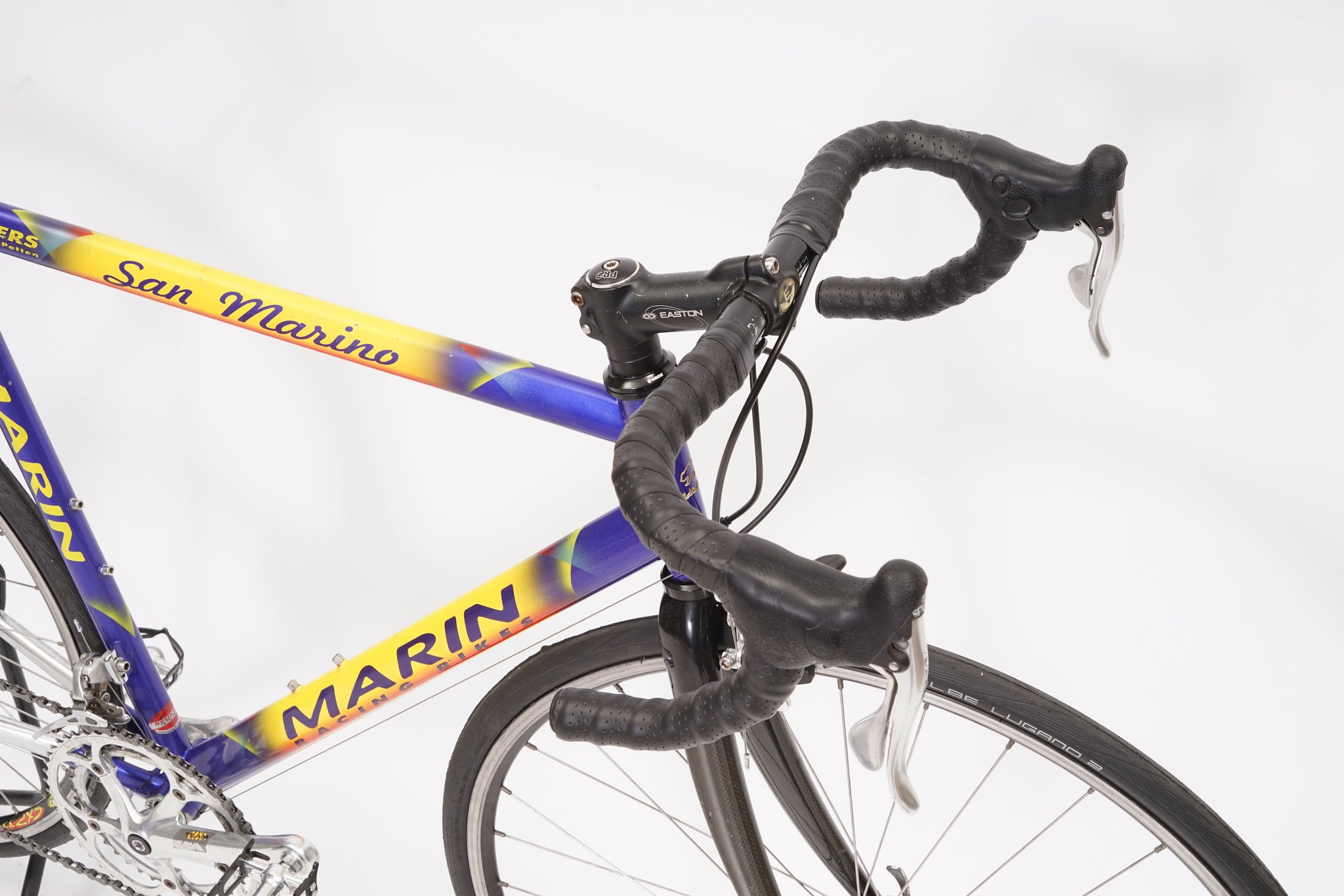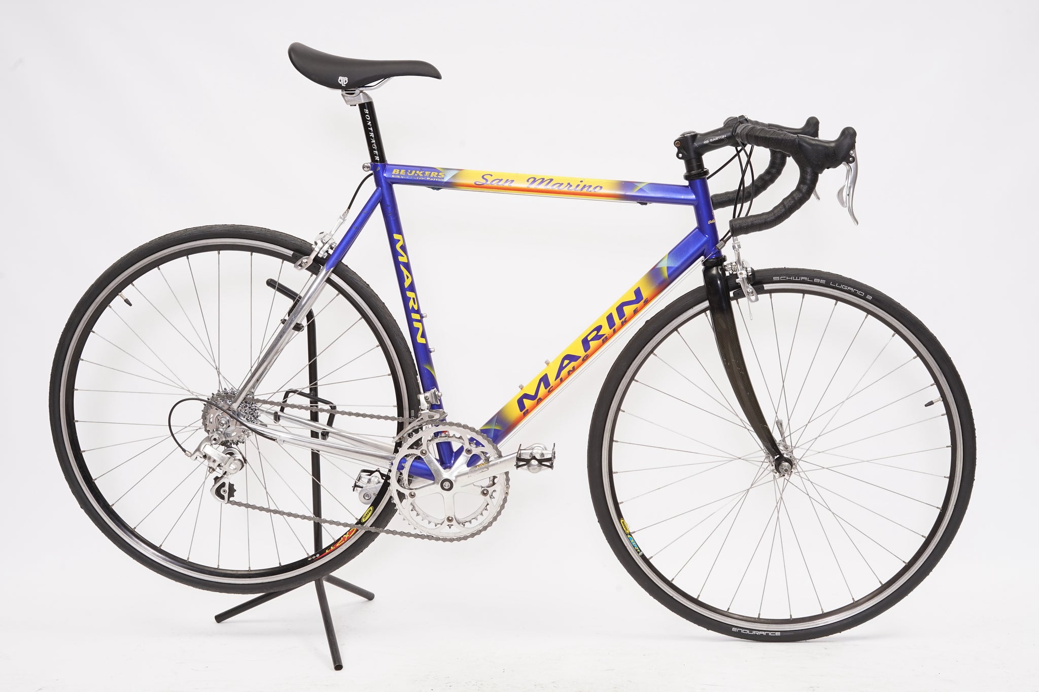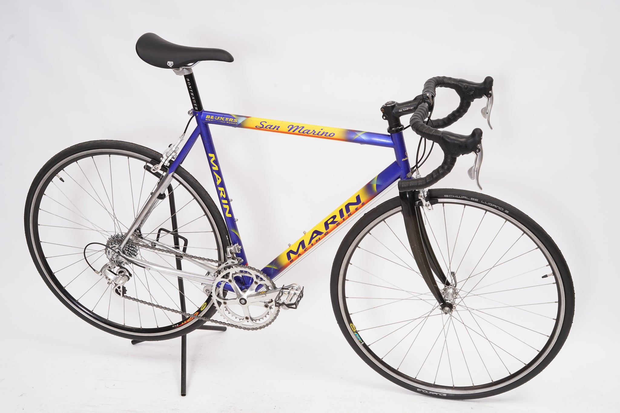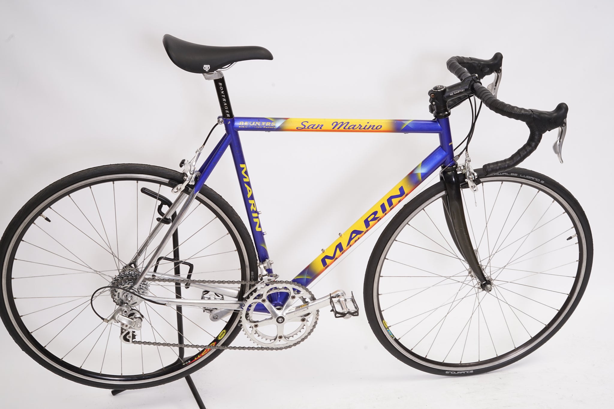 This Marin San Marino racer is great for putting in some miles while enjoying the vintage style. It is equipped with a 18-speed Campagnolo Veloce gear-group and an original wheelset containing Mavic rims. All mechanical gear parts are original and in great condition. A lightweight, super fast, piece of history.