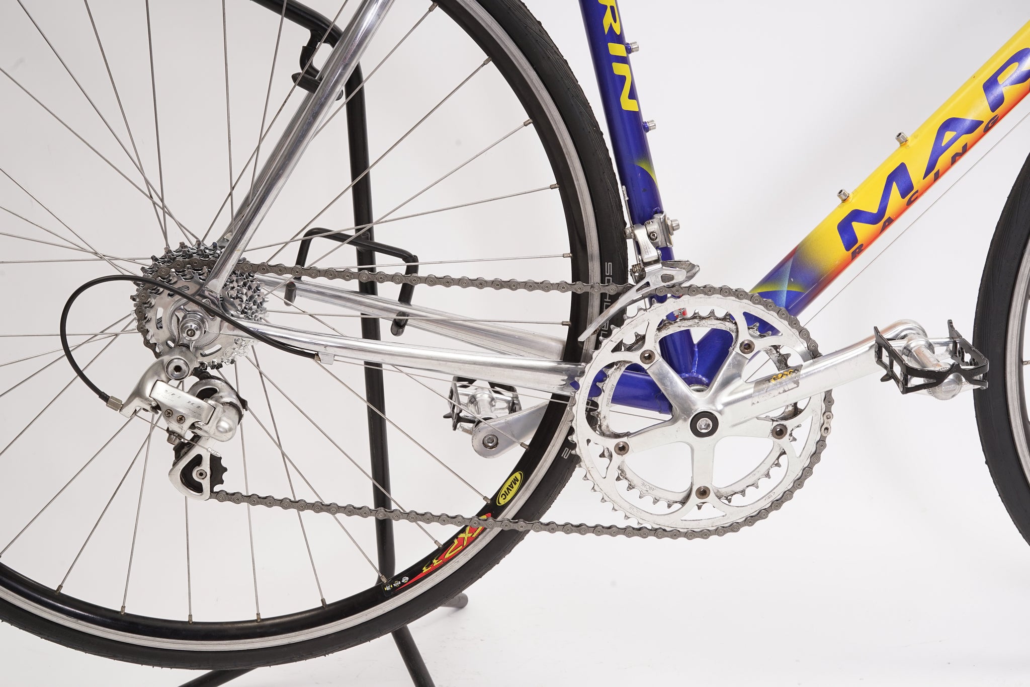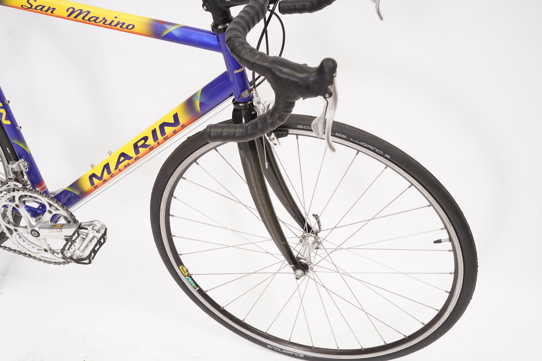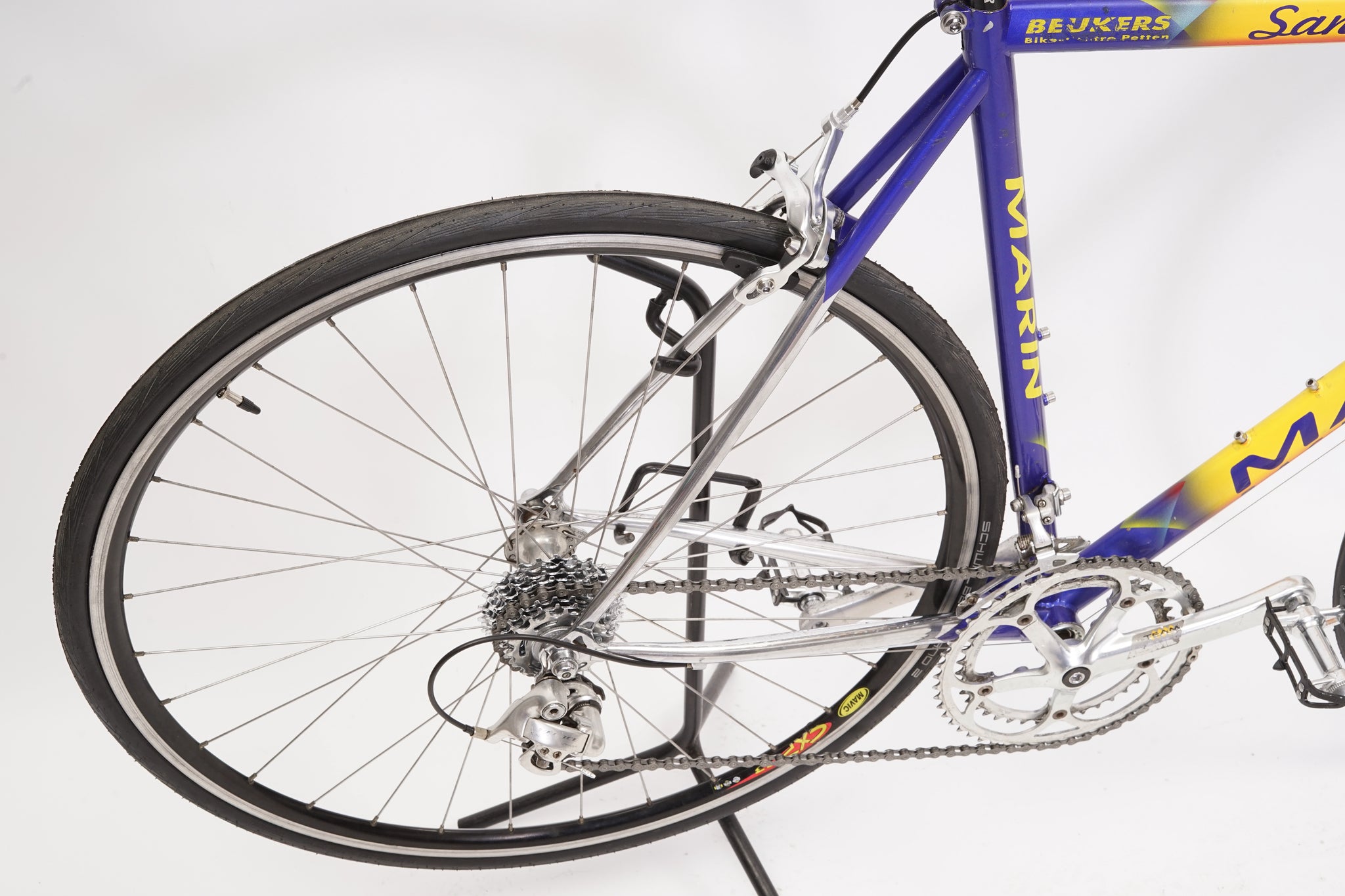 This Marin San Marino racer is great for putting in some miles while enjoying the vintage style. It is equipped with a 18-speed Campagnolo Veloce gear-group and an original wheelset containing Mavic rims. All mechanical gear parts are original and in great condition. A lightweight, super fast, piece of history.