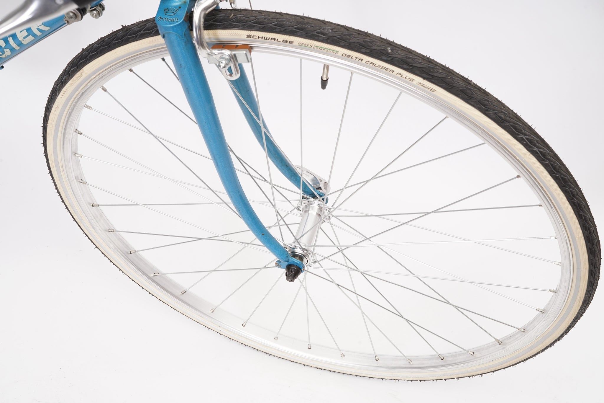 This high quality yet elegant Mercier mixte with gears dates back to the late 1970s. The convenient low top tube and Schwalbe Delta Cruiser tires make this bike ideal for day-to-day usage. The bike is equipped with a quality Shimano / Simplex gear group with 10 gears in total. Low in maintenance since most mechanical parts have been replaced. Note: The frame has some spots, all of which have been treated by a coating to ensure its ready for the future.