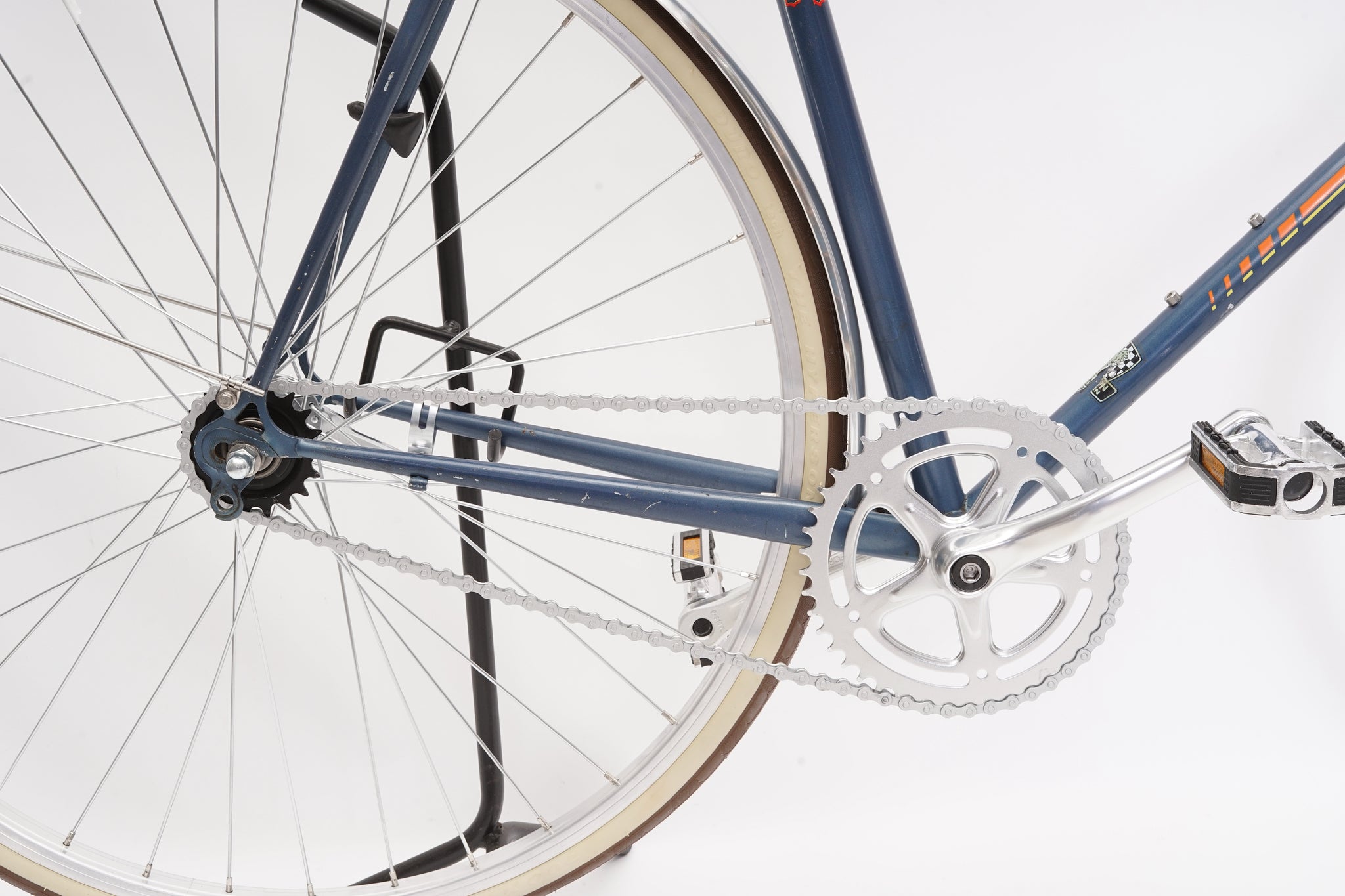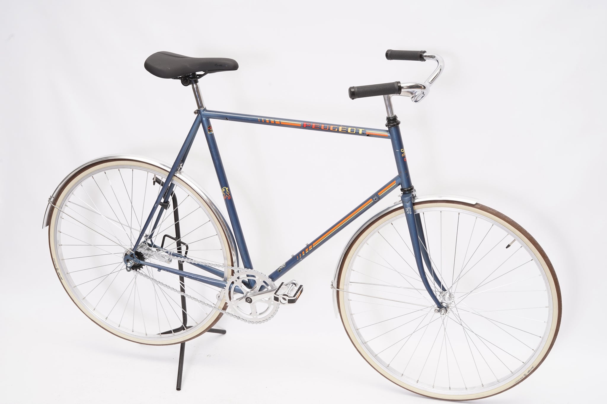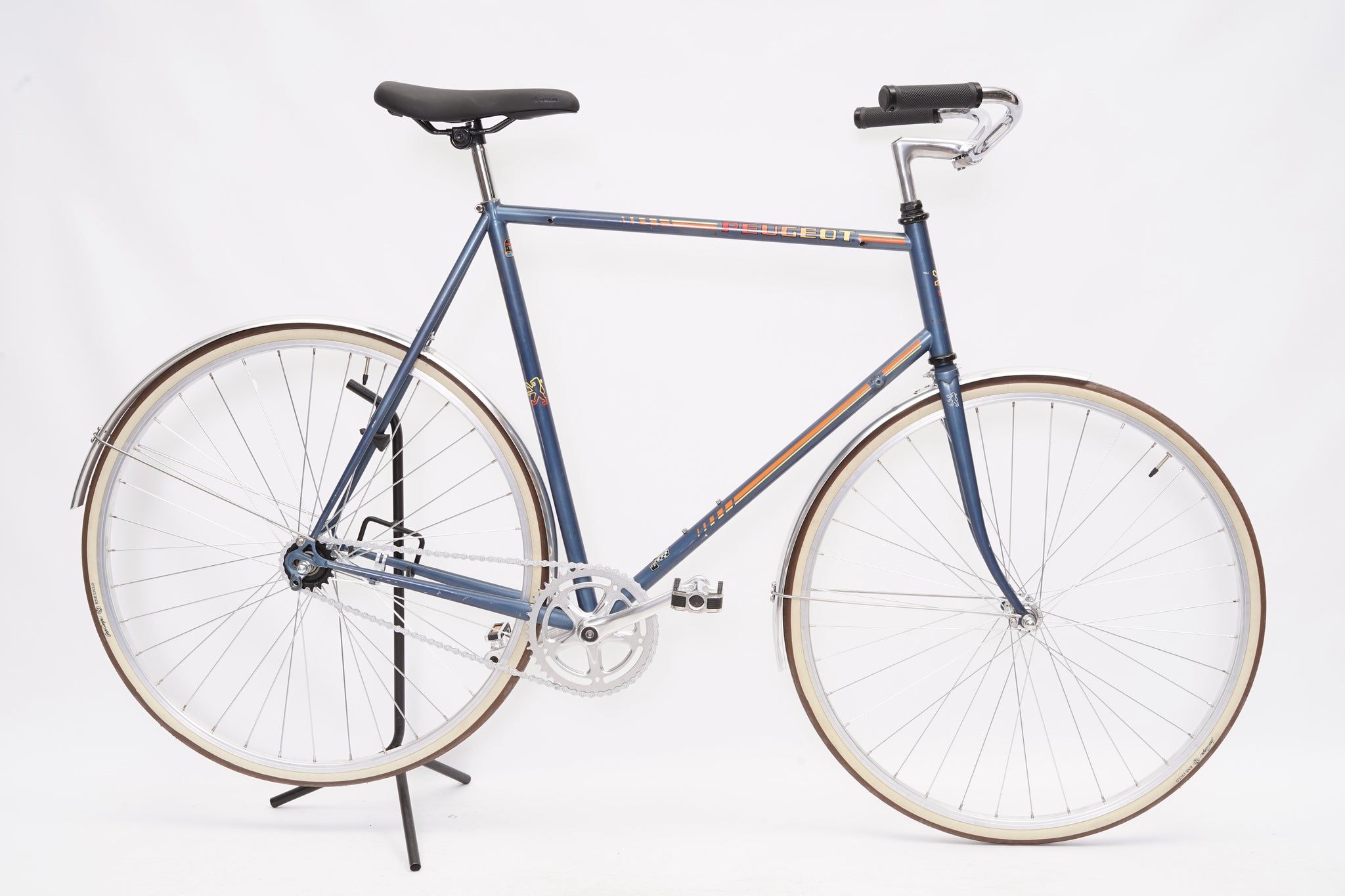 This single-speed city bike is built using a Peugeot frame from the early 1980s. The quality steel frame is combined with matching modern parts ensuring a very comfortable riding experience. Very low in maintenance since all mechanical parts have been replaced.