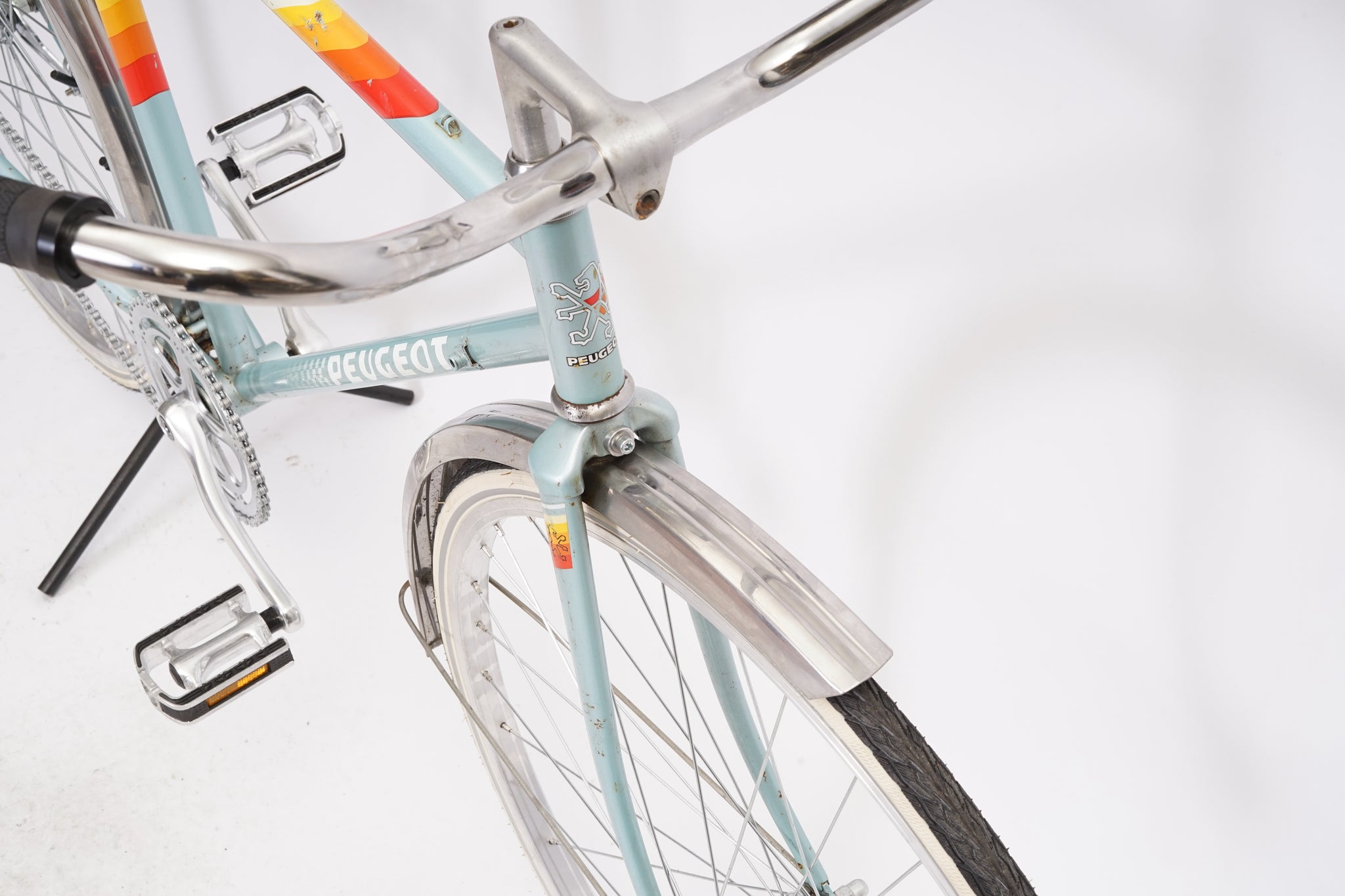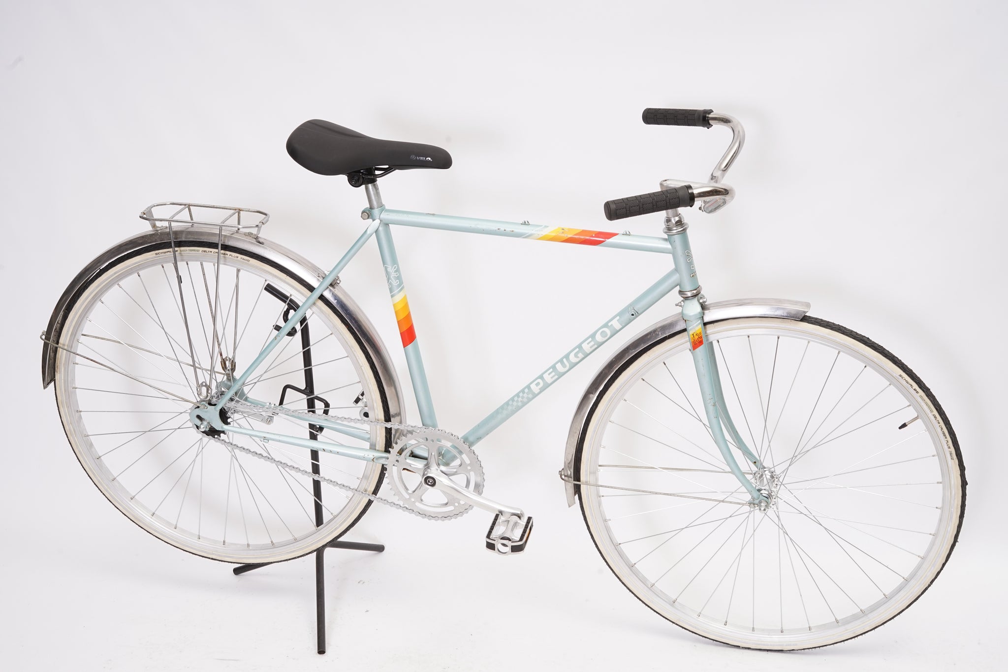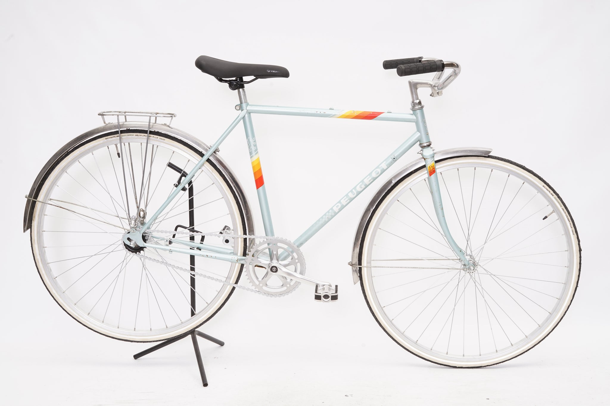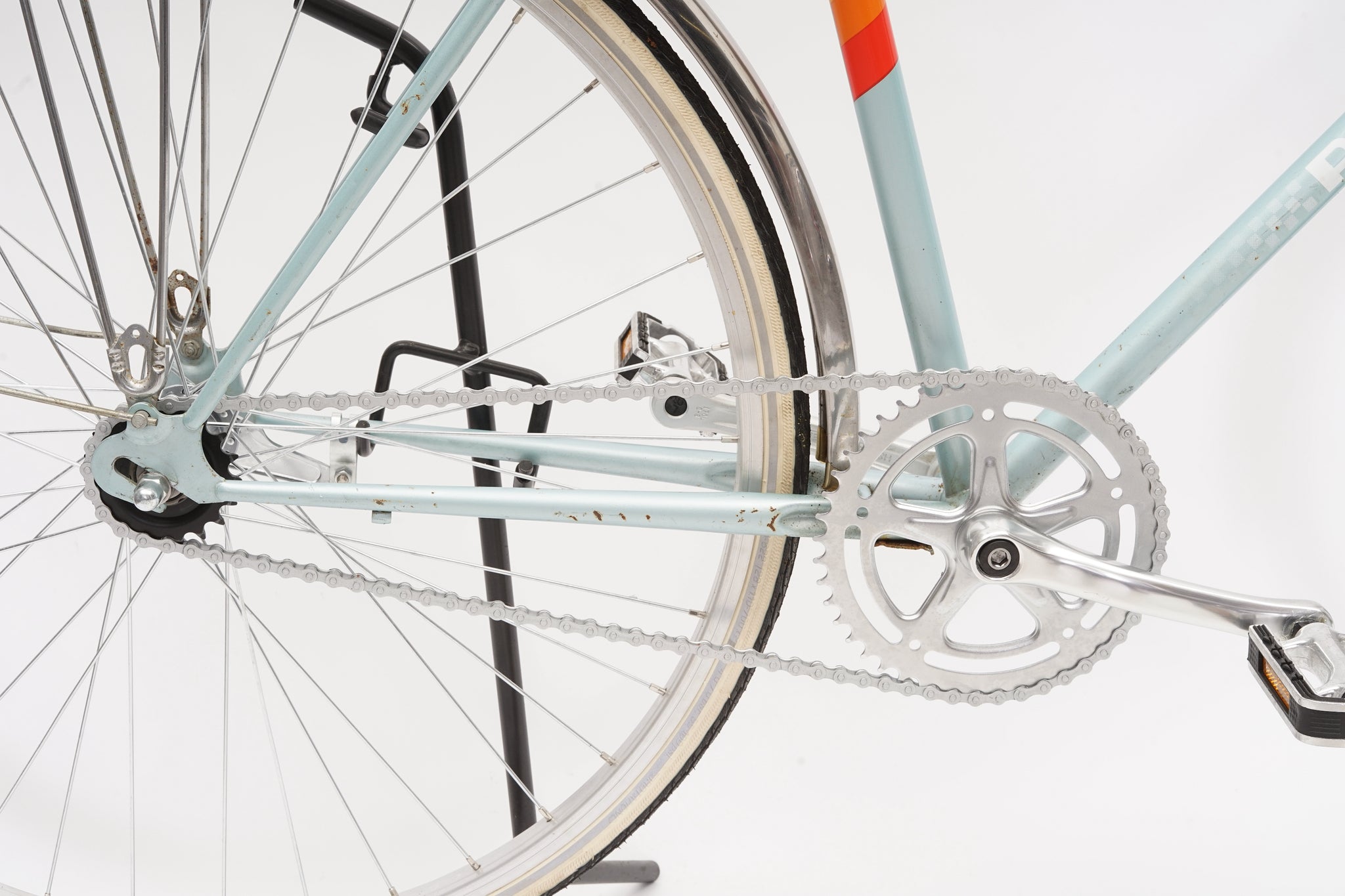 This single-speed city bike is built using a Peugeot frame from the early 1980s. The quality steel frame is combined with matching modern parts ensuring a very comfortable riding experience. Very low in maintenance since all mechanical parts have been replaced.
