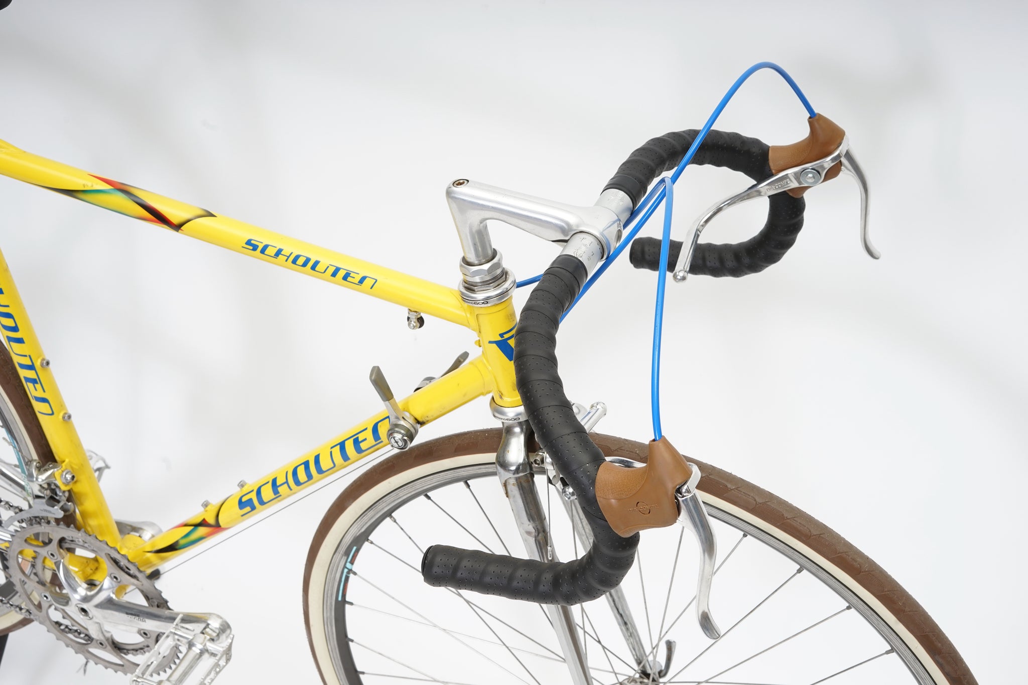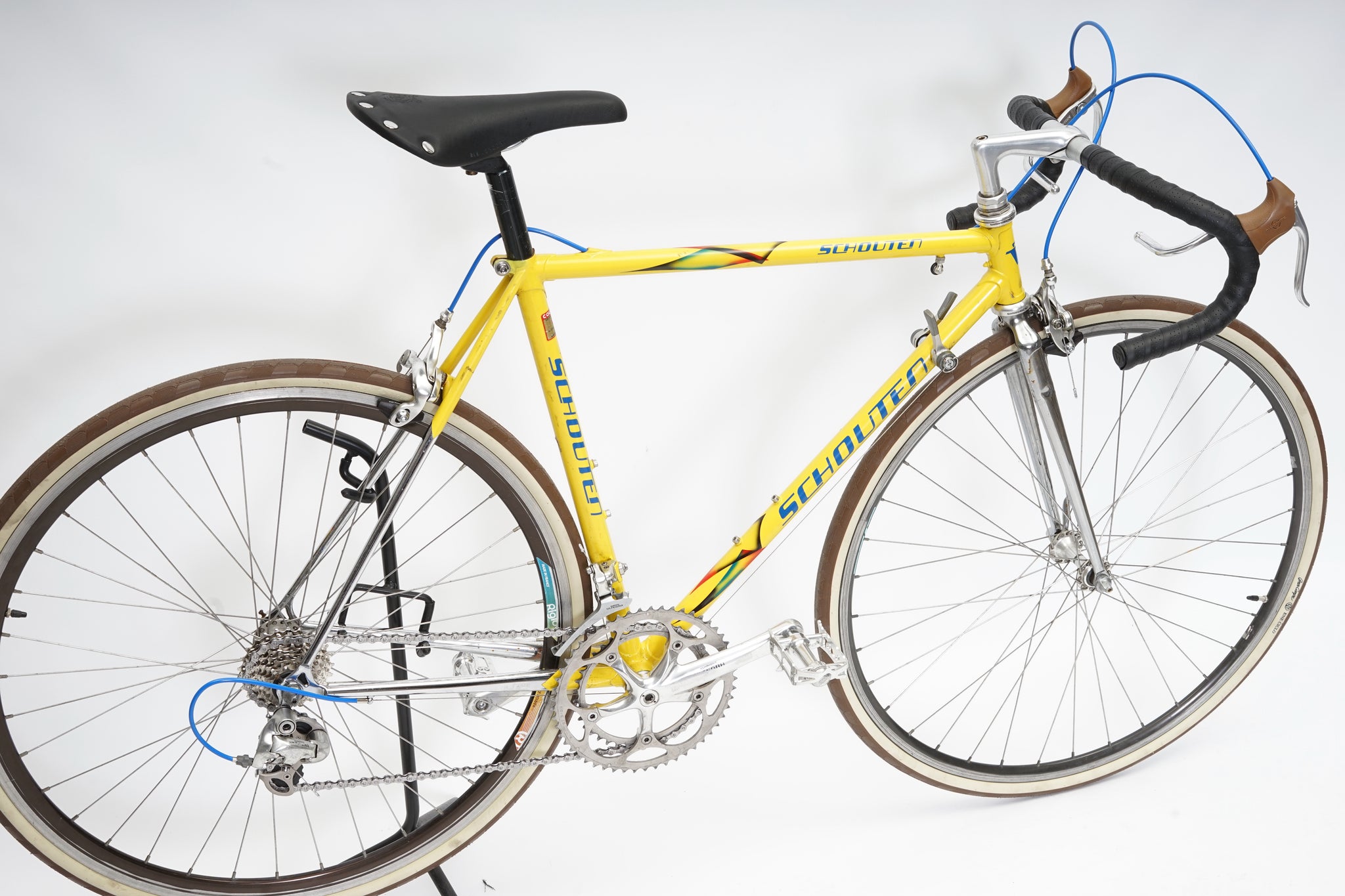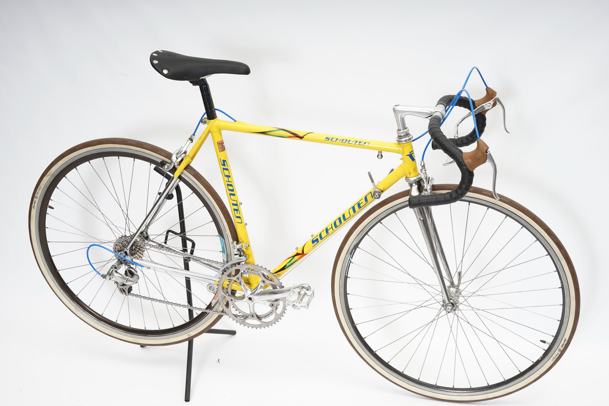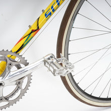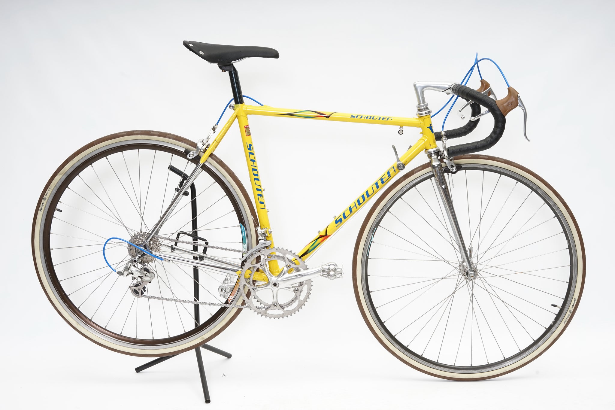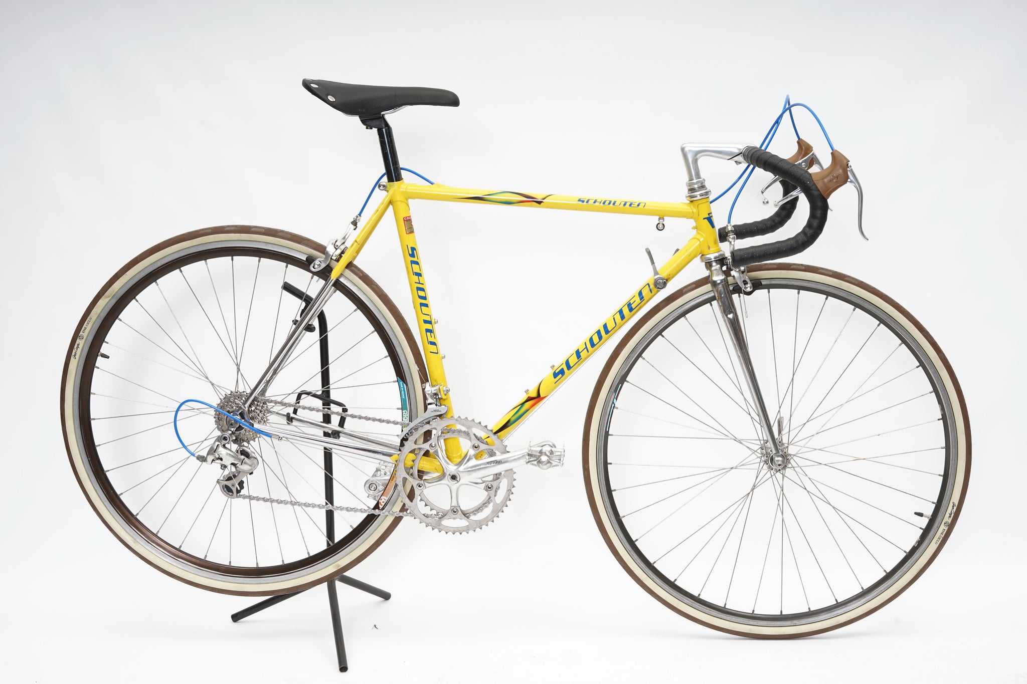 This Schouten racer is great for putting in some miles while enjoying the vintage style. It is equipped with a 16-speed Shimano gear-group and an original wheelset. All mechanical gear parts are original and in great condition. A lightweight, super fast, piece of history. Note: The fork has a small (only optical) dent on the drivetrain side as shown in picture.