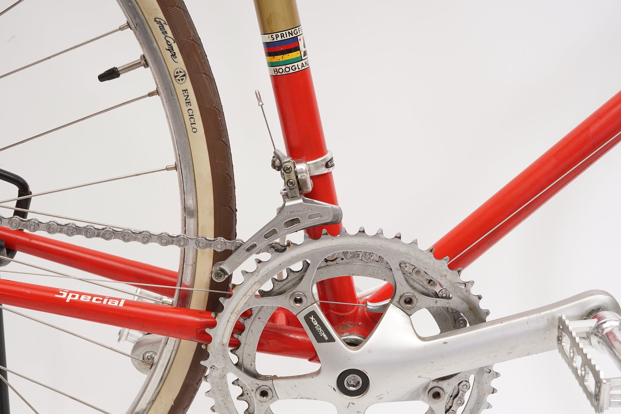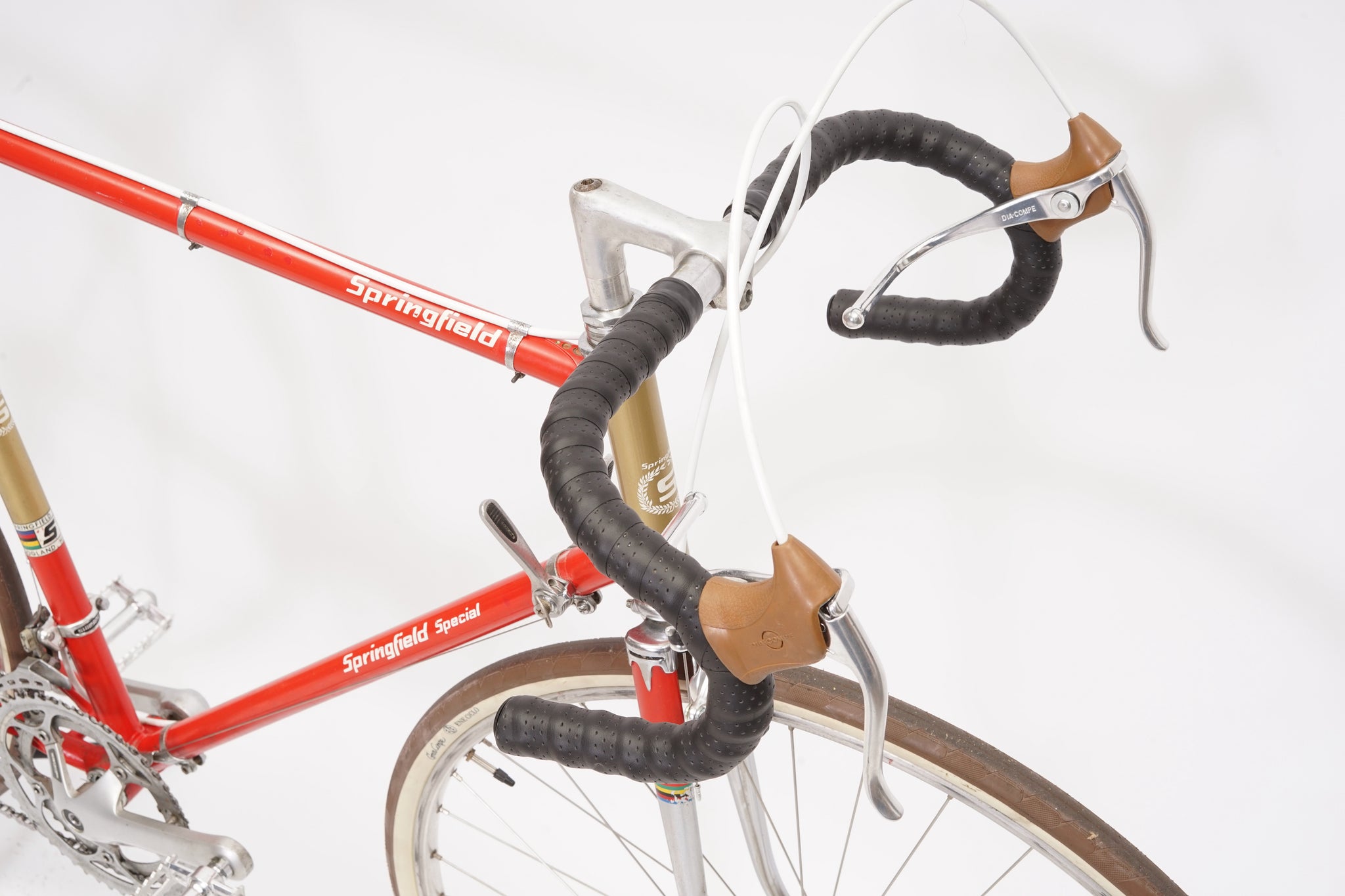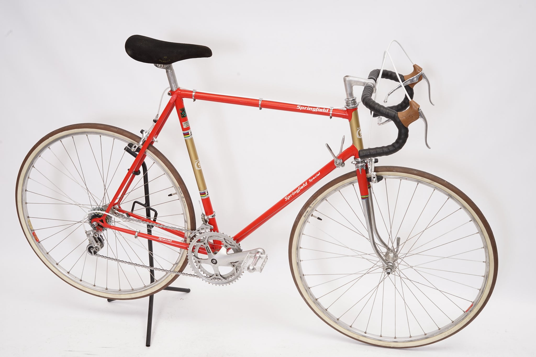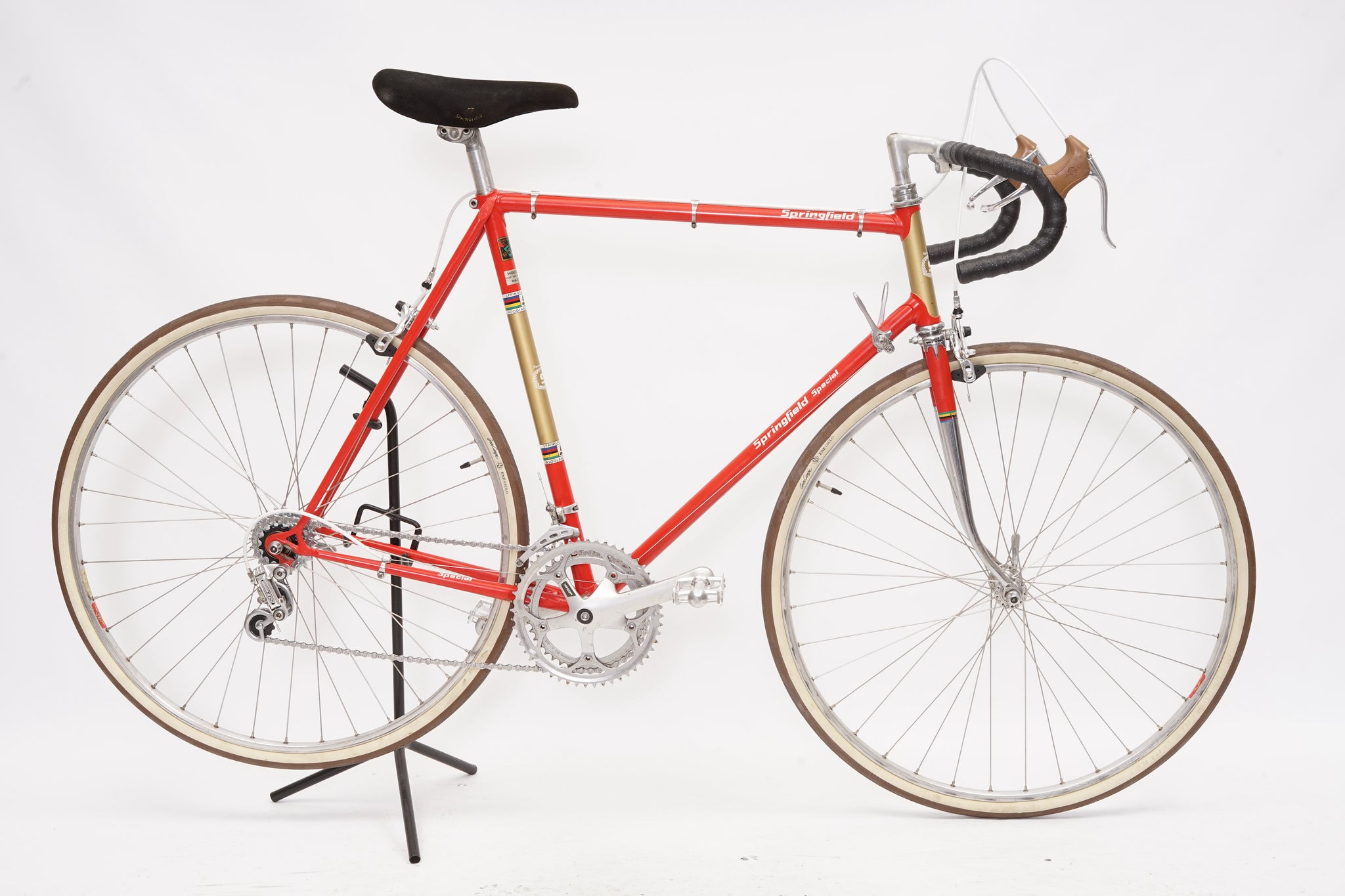 This Springfield Special racer is great for putting in some miles while enjoying the vintage style. It is equipped with a 10-speed Shimano gear-group and an original wheelset containing Mavic rims and Shimano hubs. All mechanical gear parts are original and in great condition. A lightweight, super fast, piece of history.