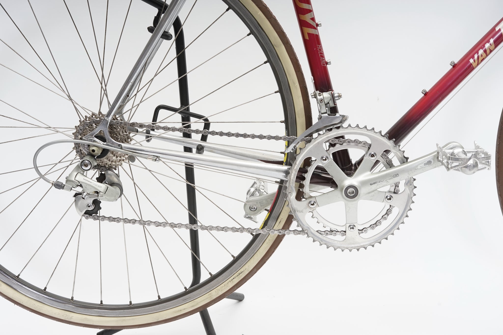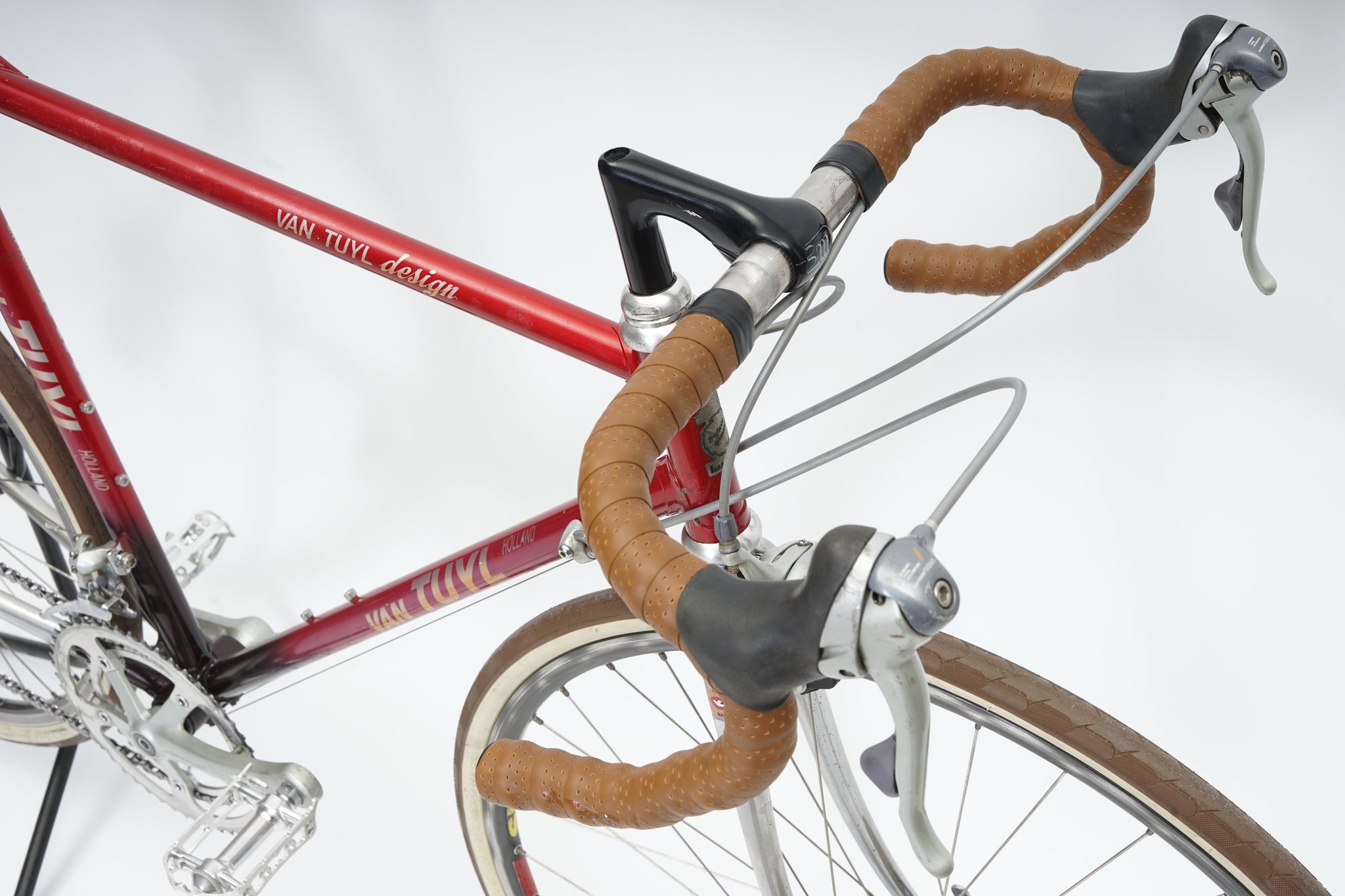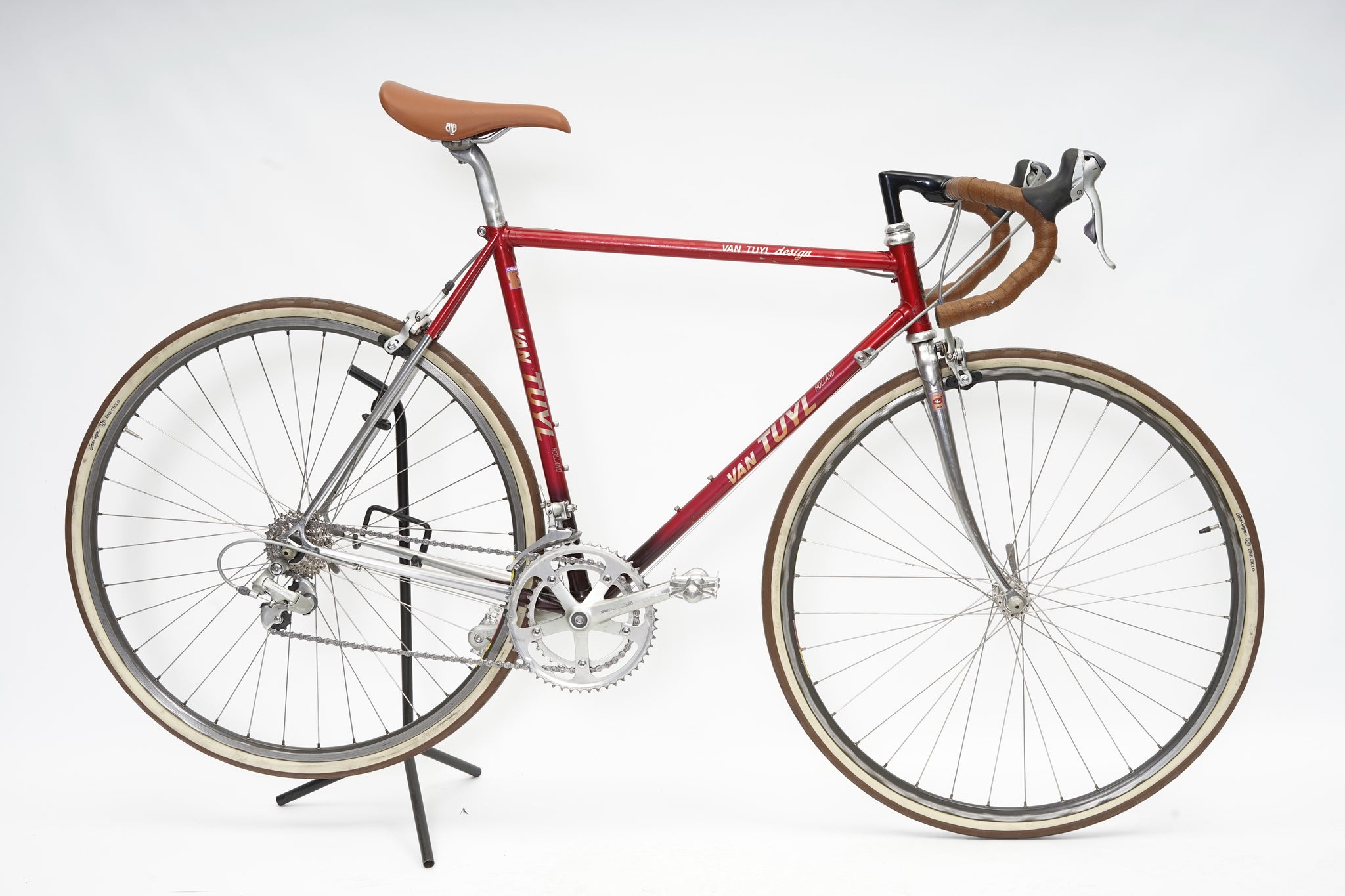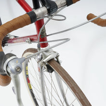 This Van Tuyl racer is great for putting in some miles while enjoying the vintage style. It is equipped with a 16-speed Shimano gear-group with modern shifters on the handlebar. All mechanical parts are in great condition. A lightweight, super fast, piece of history.
